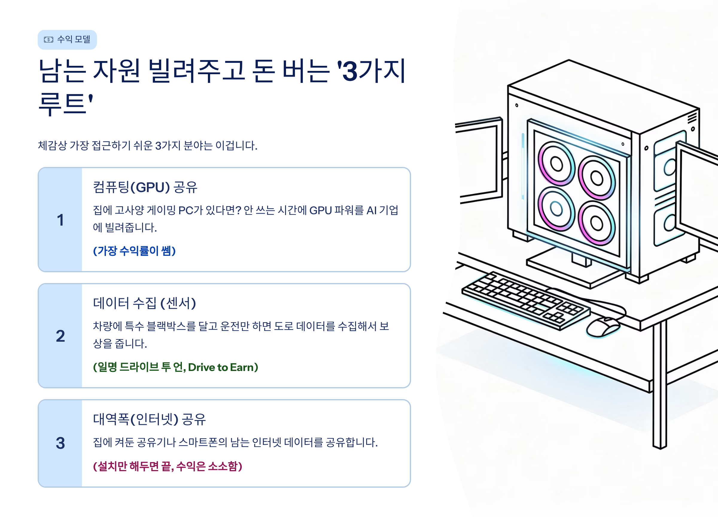 - 컴퓨팅(GPU) 공유: 집에 고사양 게이밍 PC가 있다면? 안 쓰는 시간에 GPU 파워를 AI 기업에 빌려줍니다. (가장 수익률이 쎔)