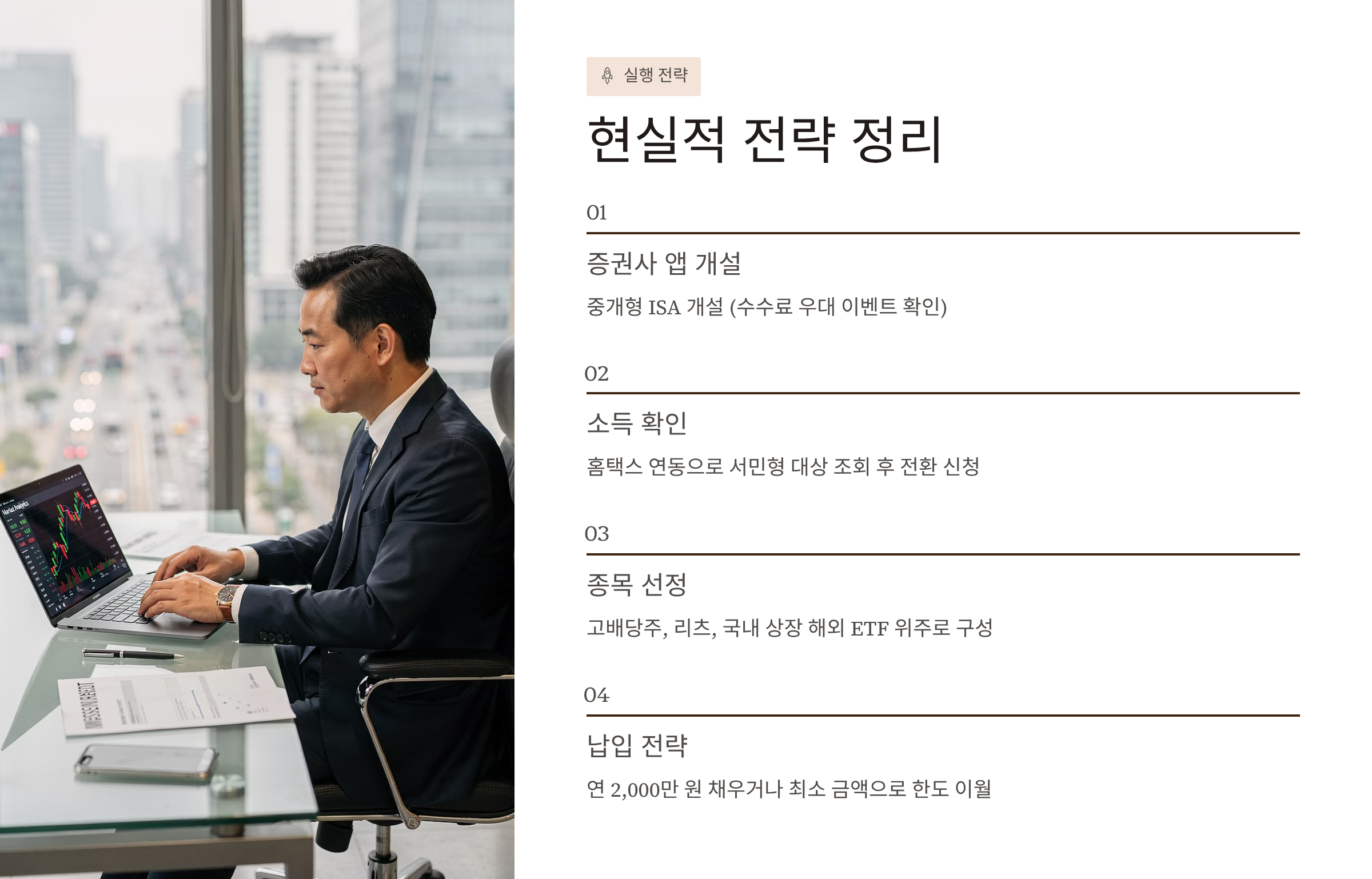 - 증권사 앱 켜기: '중개형 ISA' 개설 (이벤트로 수수료 평생 우대 주는 곳 찾으세요).