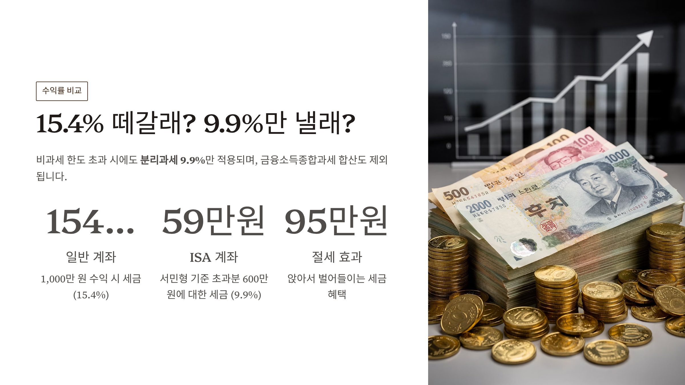 근데 ISA는 한도를 초과한 수익에 대해서 딱 9.9%만 떼고 끝냅니다. 금융소득종합과세 합산도 안 시켜요.