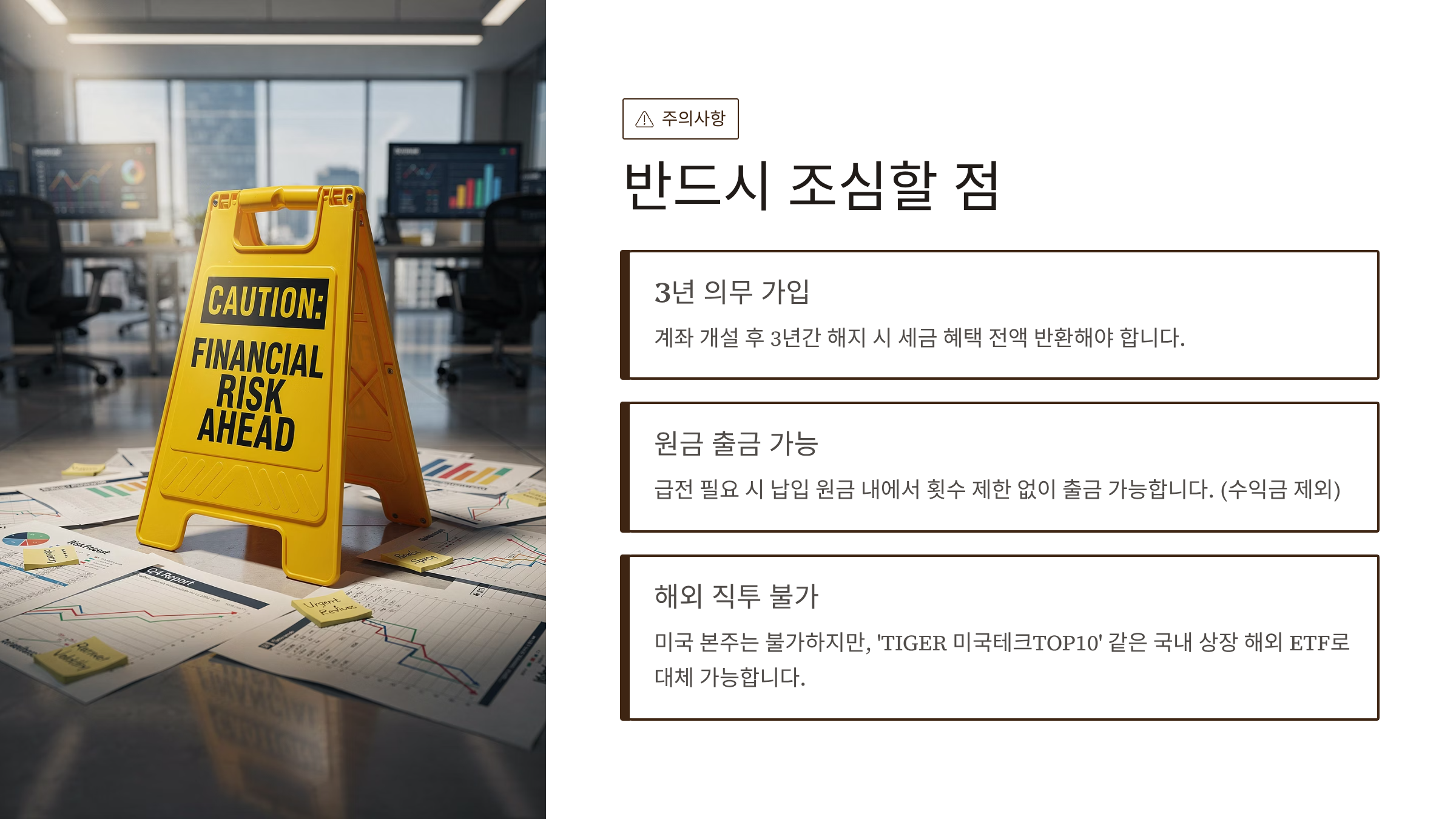 - 3년 묶임: 계좌 개설 후 3년 동안은 계좌를 해지하면 안 됩니다. 해지하면 그동안 받은 세금 혜택 다 토해내야 합니다.