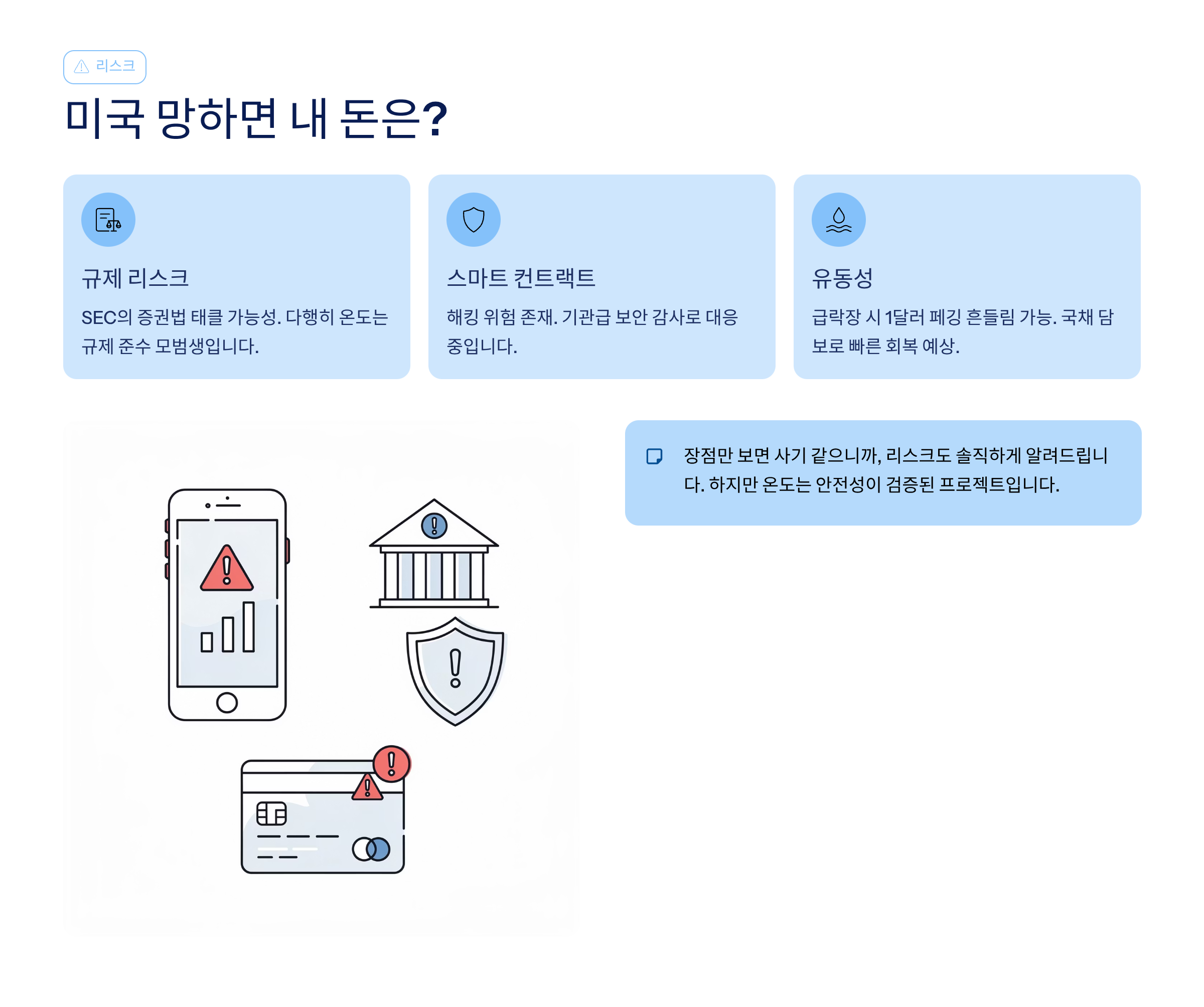 - 리스크: "미국 망하면 내 돈은?" (스테이블코인 디페깅 이슈)