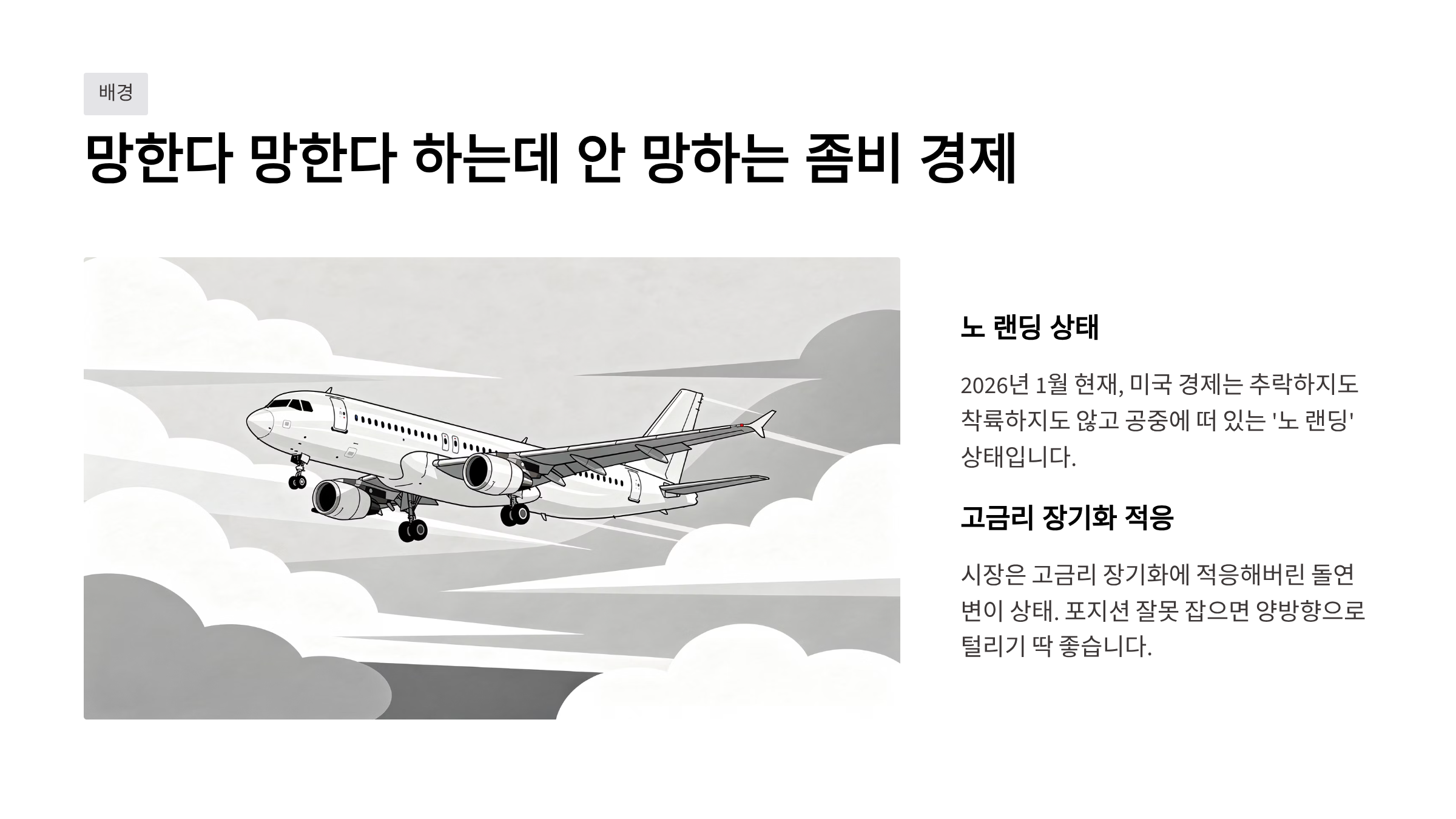 2026년 1월 현재, 미국 경제는 '노 랜딩(No Landing)'에 가깝습니다. 추락하지도 않고, 그렇다고 시원하게 착륙하지도 않고 공중에 떠 있는 상태죠.