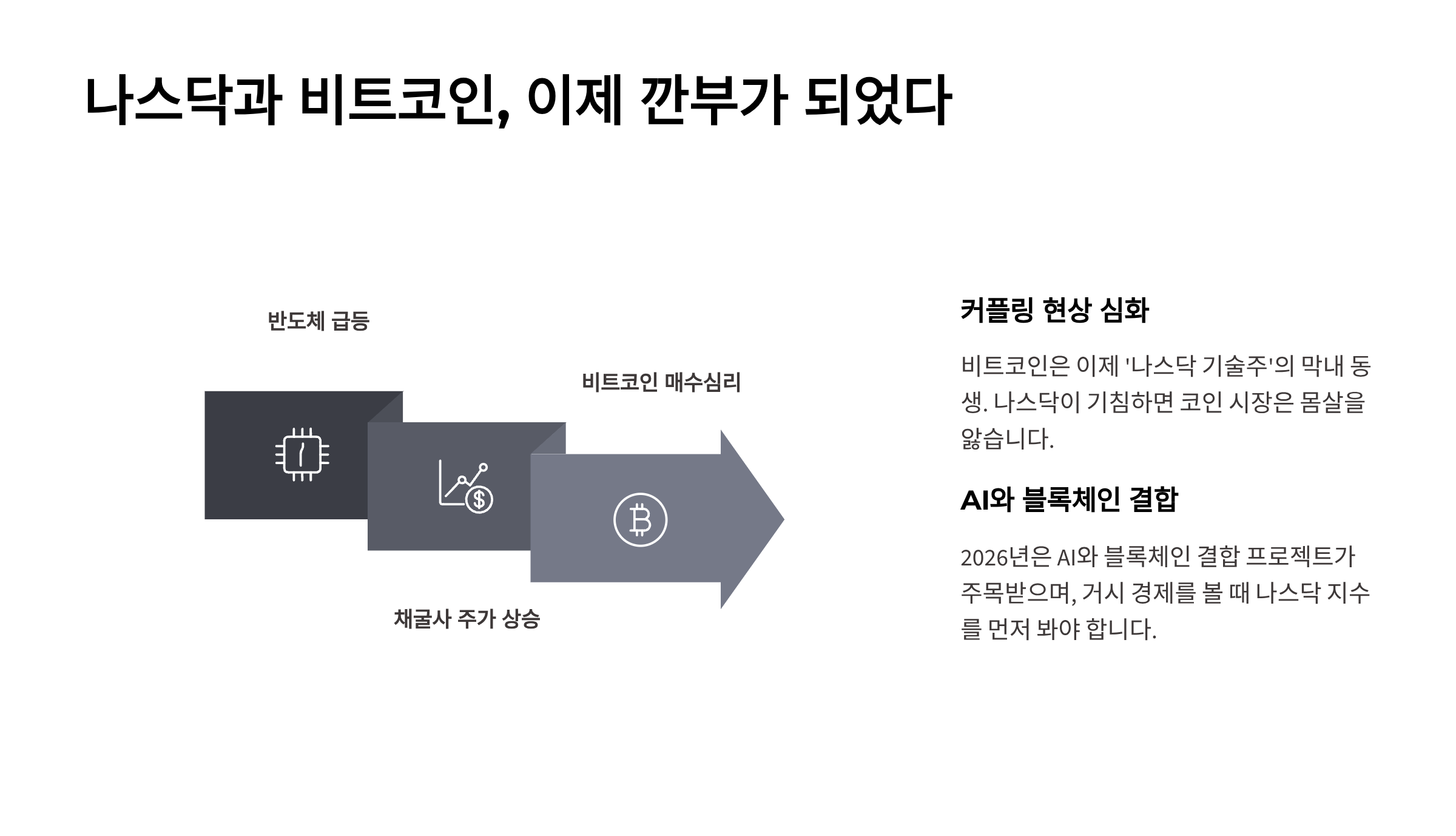 특히 2026년은 AI와 블록체인이 결합하는 프로젝트들이 주목받으면서, 나스닥이 기침하면 코인 시장은 몸살을 앓는 커플링(Coupling) 현상이 심화되었습니다. 즉, 거시 경제를 볼 때 나스닥 지수를 먼저 봐야 코인 방향이 보입니다.