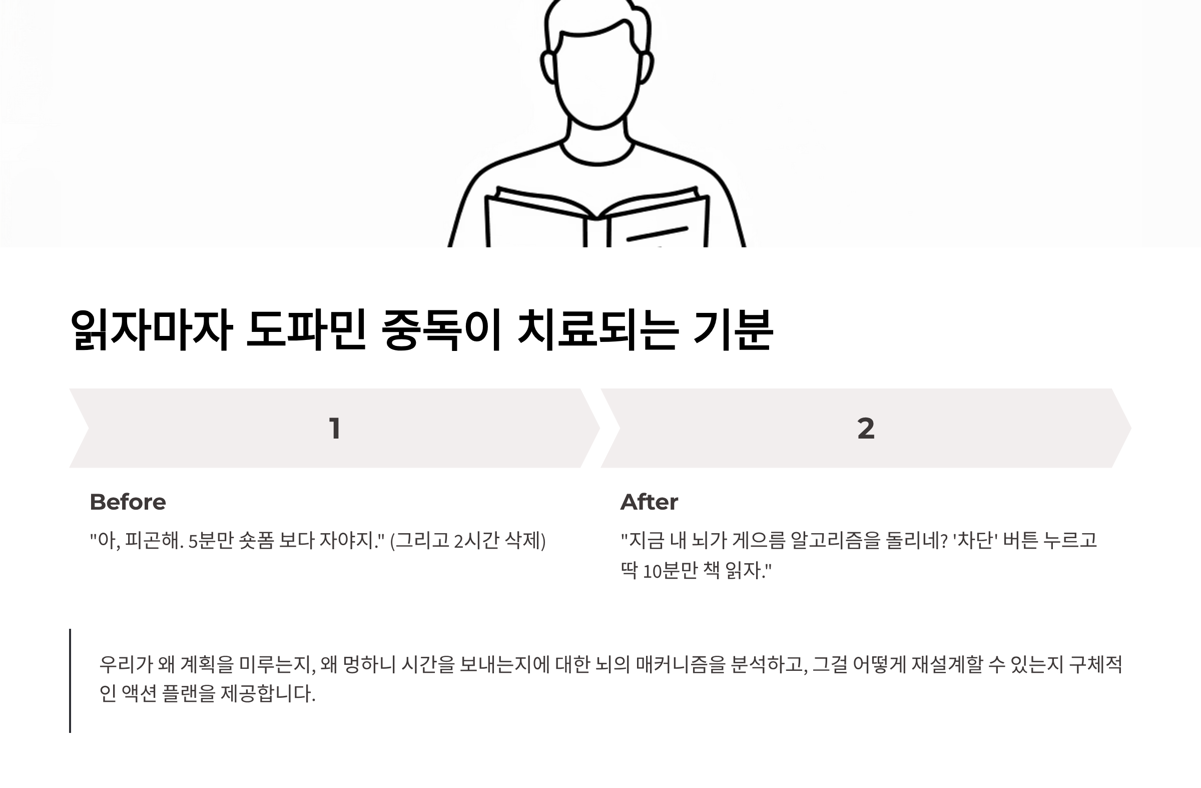 - After: "지금 내 뇌가 게으름 알고리즘을 돌리네? '차단' 버튼 누르고 딱 10분만 책 읽자."