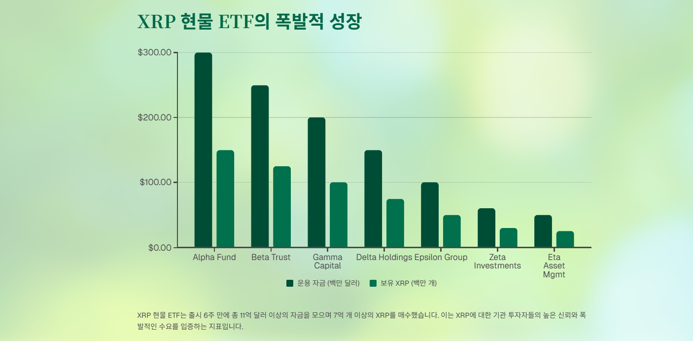- '구조적인 매수세': ETF는 운용 자산만큼의 실제 XRP를 시장에서 사들여 보유해야 합니다. 출시 6주 만에 7개의 ETF가 11억 달러 이상의 자금을 모으며 7억 개가 넘는 XRP를 매수했습니다. 이는 시장에 '지속적이고 구조적인 매수 압력'을 만들어내며 가격을 단단하게 지지하는 역할을 합니다.