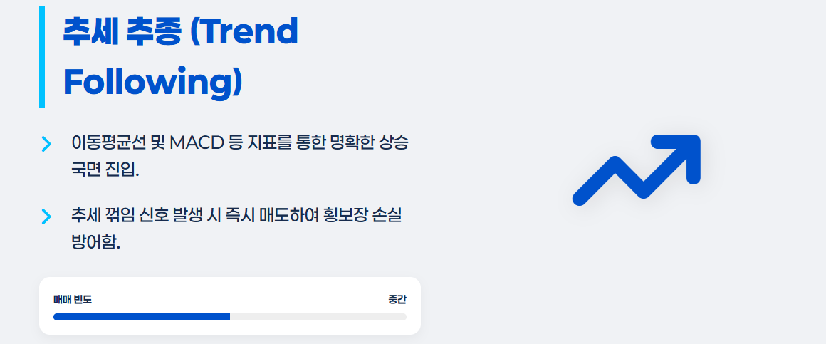 명확한 '상승 추세'에서만 투자하는 고전적인 방식이다. 이동평균선, MACD 등 기술적 지표를 통해 상승 추세가 확인될 때 진입하고, 추세가 꺾이는 신호가 나타나면 미련 없이 매도한다. 횡보장에서의 손실을 피하기 위한 단기~중기 전략이다.