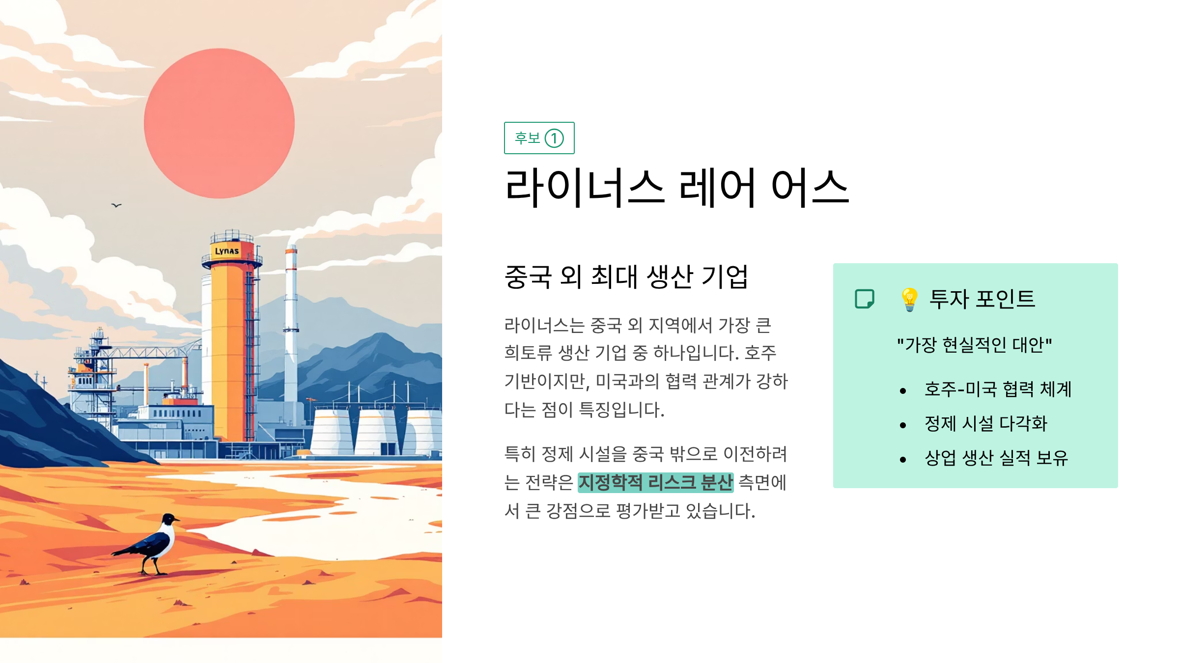 라이너스는 중국 외 지역에서 가장 큰 희토류 생산 기업 중 하나입니다. 호주 기반이지만, 미국과의 협력 관계가 강하다는 점이 특징입니다. 특히 정제 시설을 중국 밖으로 이전하려는 전략은 지정학적 리스크 분산 측면에서 큰 강점으로 평가받고 있습니다. 저는 라이너스를 보면서 “가장 현실적인 대안”이라는 느낌을 받았습니다 👍