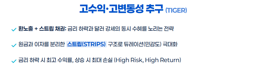 * 금리 인하 효과를 극대화하고, 달러 강세까지 기대하며, 높은 변동성을 감수할 수 있다면? → TIGER