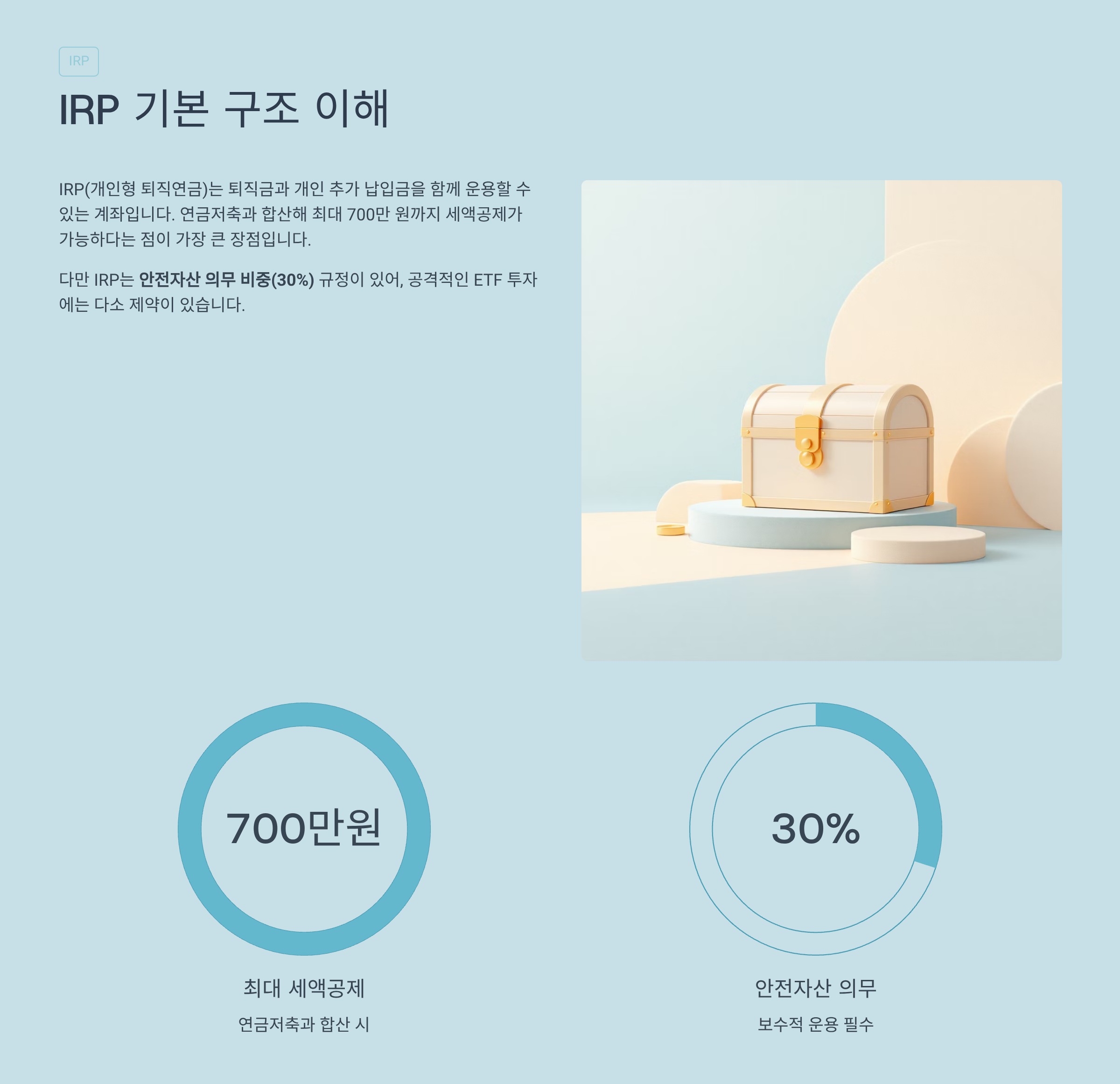 IRP(개인형 퇴직연금)는 퇴직금과 개인 추가 납입금을 함께 운용할 수 있는 계좌입니다. 연금저축과 합산해 최대 700만 원까지 세액공제가 가능하다는 점이 가장 큰 장점입니다. 다만 IRP는 안전자산 의무 비중(30%) 규정이 있어, 공격적인 ETF 투자에는 다소 제약이 있습니다. 실제로 운용해보면 “조금 더 보수적인 계좌”라는 느낌을 받게 됩니다 🤔