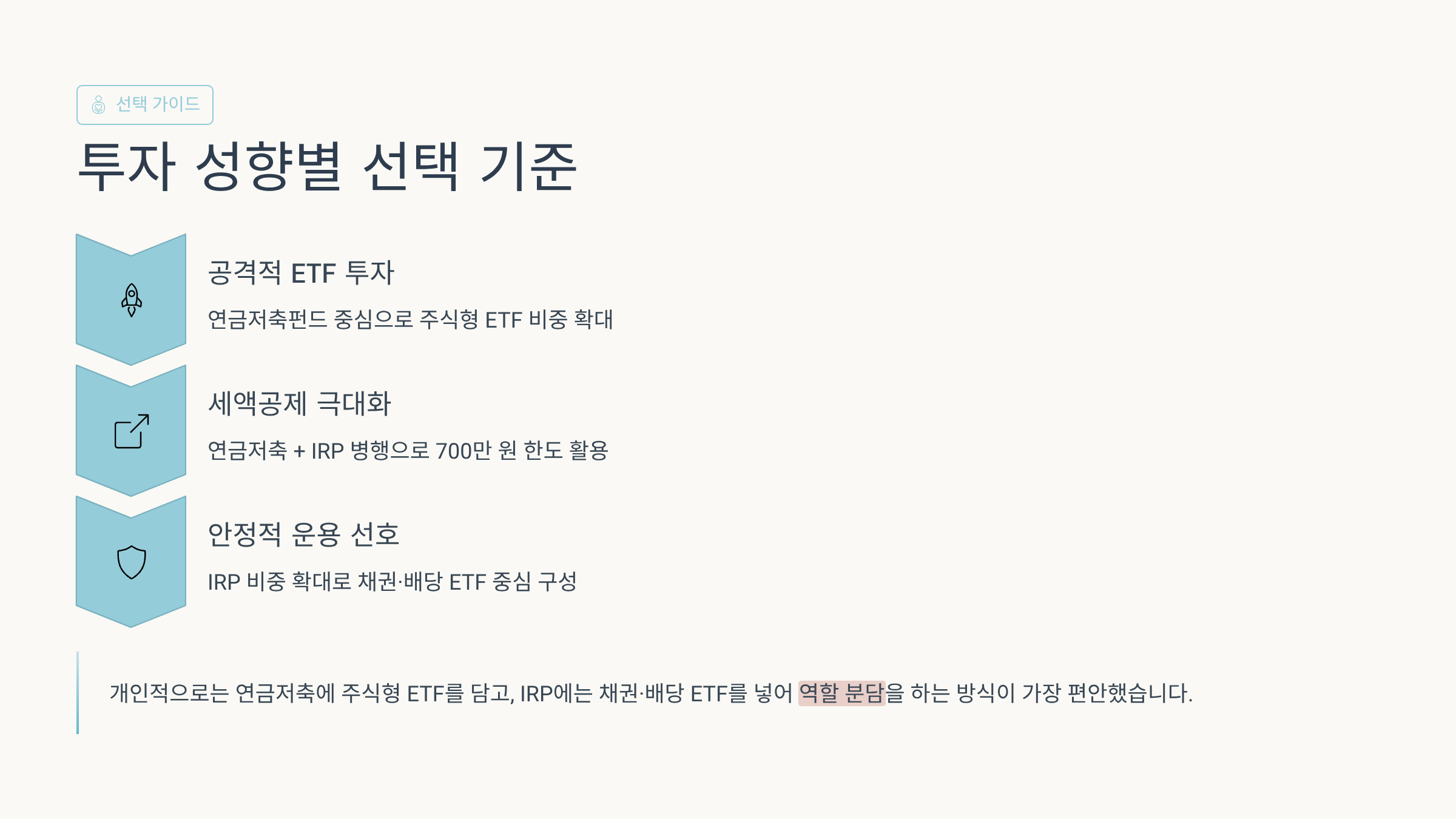 저 개인적으로는 연금저축에 주식형 ETF를 담고, IRP에는 채권·배당 ETF를 넣어 역할 분담을 하는 방식이 가장 편안했습니다 👍