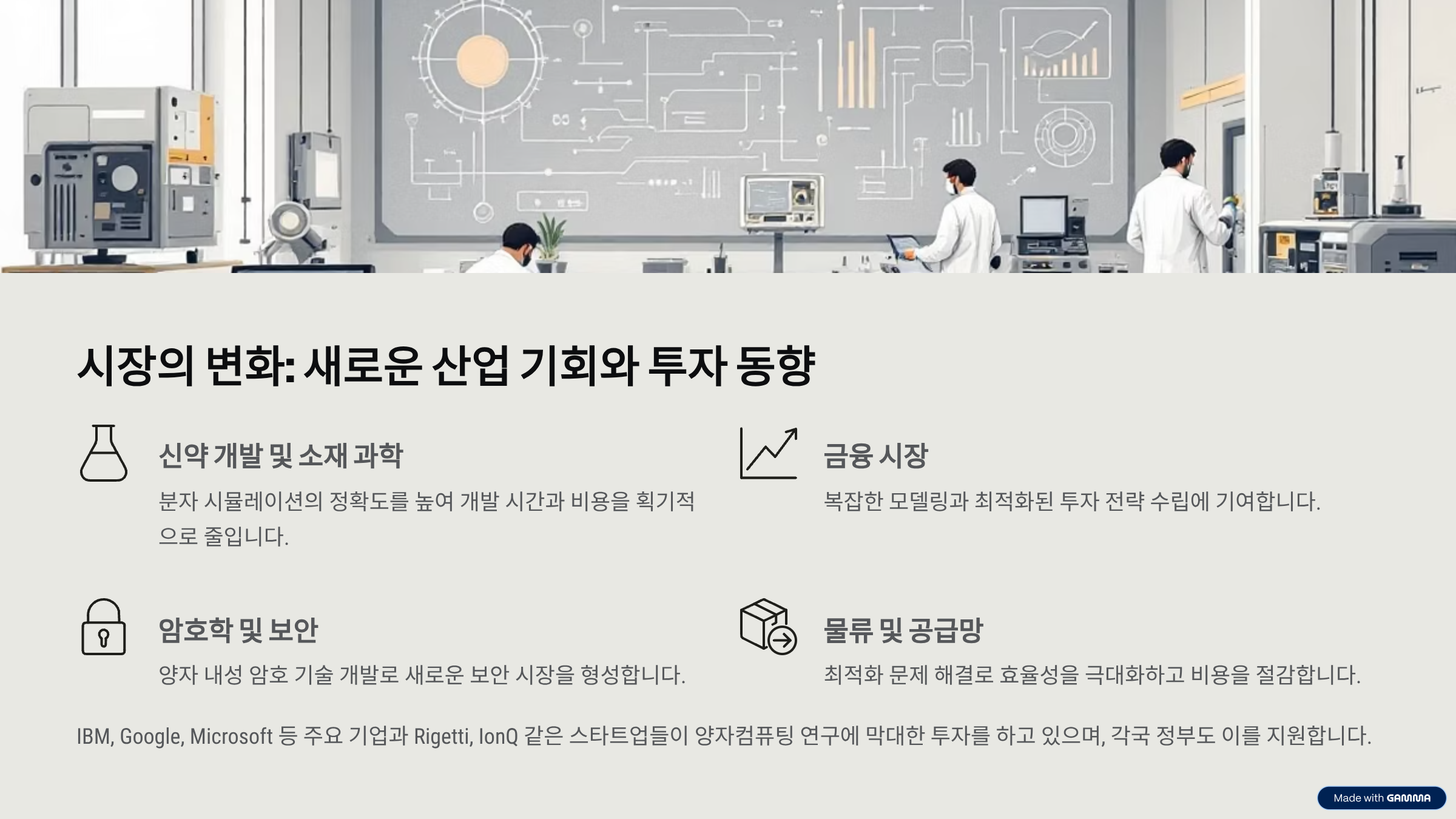 양자컴퓨팅의 독특한 작동 방식은 새로운 산업 기회를 창출한다. 신약 개발, 소재 과학 분야에서 분자 시뮬레이션의 정확도를 높인다. 이는 개발 시간과 비용을 획기적으로 줄일 수 있다. 🧪 금융 시장에서는 복잡한 모델링과 최적화된 투자 전략 수립에 기여한다. 📈