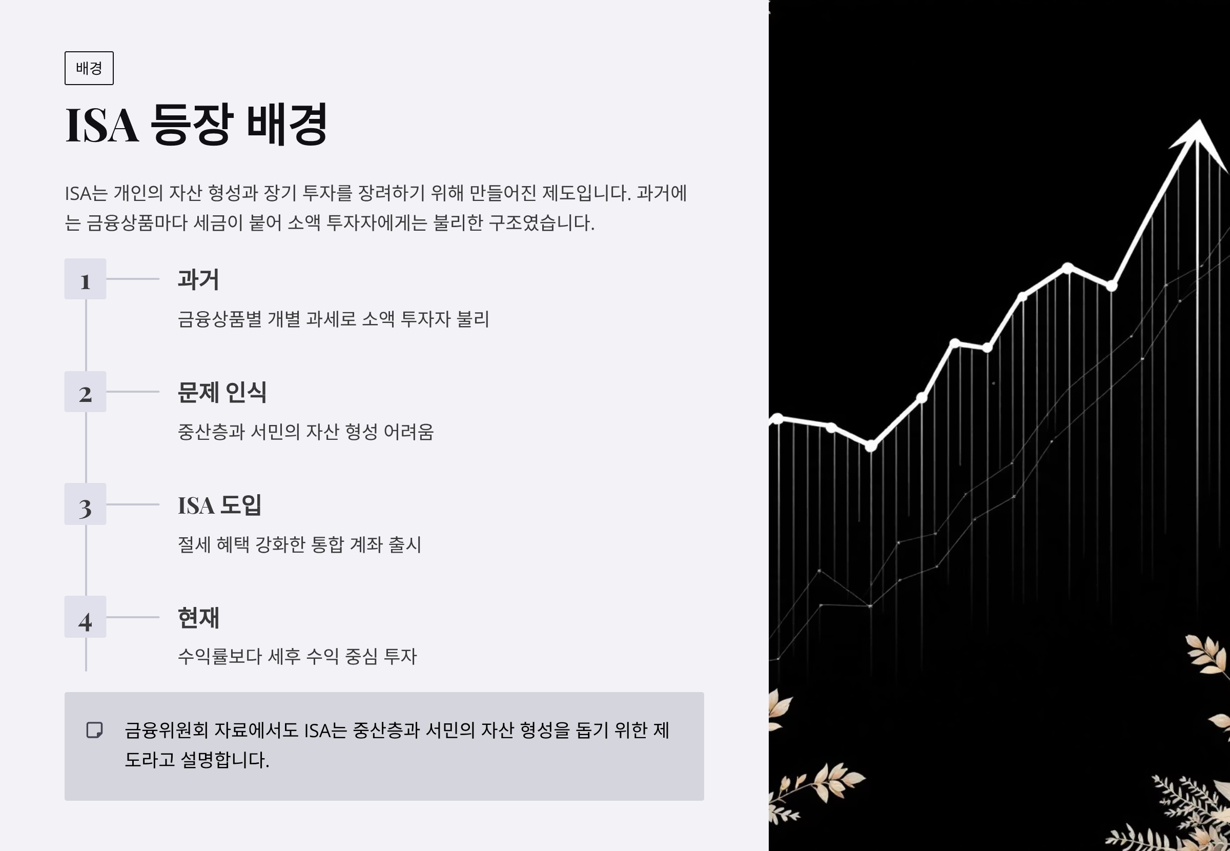 ISA는 개인의 자산 형성과 장기 투자를 장려하기 위해 만들어진 제도입니다. 과거에는 금융상품마다 세금이 붙어 소액 투자자에게는 불리한 구조였습니다. 이런 문제를 개선하기 위해 정부가 절세 혜택을 강화한 통합 계좌를 도입한 것이 바로 ISA입니다. 금융위원회 자료에서도 ISA는 중산층과 서민의 자산 형성을 돕기 위한 제도라고 설명합니다. 실제로 저도 ISA를 알고 나서 ‘수익률보다 세후 수익이 더 중요하구나’라는 생각을 처음 하게 되었습니다. 📈