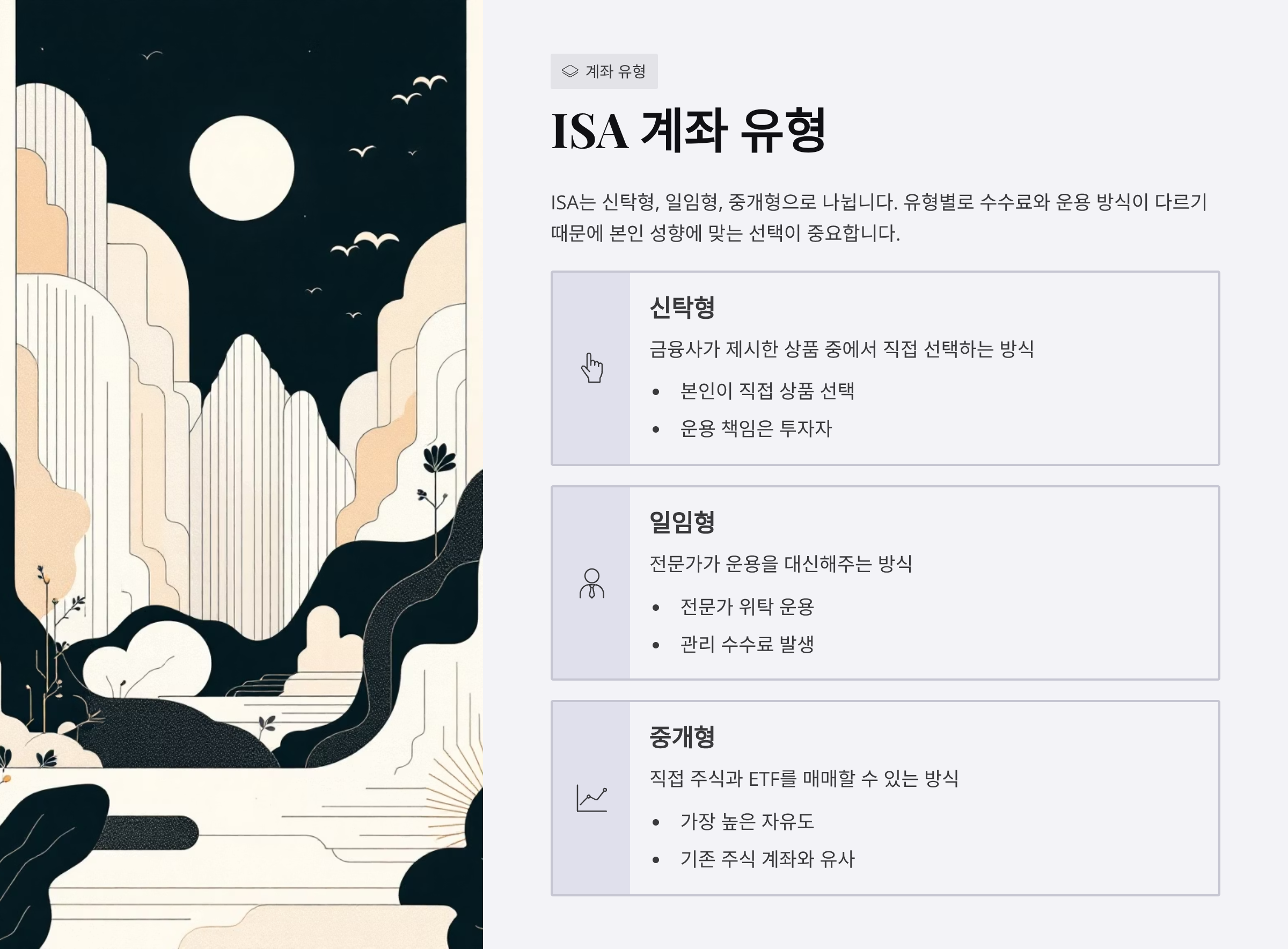 ISA는 신탁형, 일임형, 중개형으로 나뉩니다. 신탁형은 금융사가 제시한 상품 중에서 직접 선택하는 방식이고, 일임형은 전문가가 운용을 대신해줍니다. 중개형 ISA는 가장 자유도가 높아 직접 주식과 ETF를 매매할 수 있습니다. 개인적으로는 중개형 ISA가 가장 익숙했고, 기존 주식 계좌와 거의 비슷해 접근이 쉬웠습니다. 다만 유형별로 수수료와 운용 방식이 다르기 때문에 본인 성향에 맞는 선택이 중요합니다. ✅ [표 삽입 위치: ISA 유형 비교표]