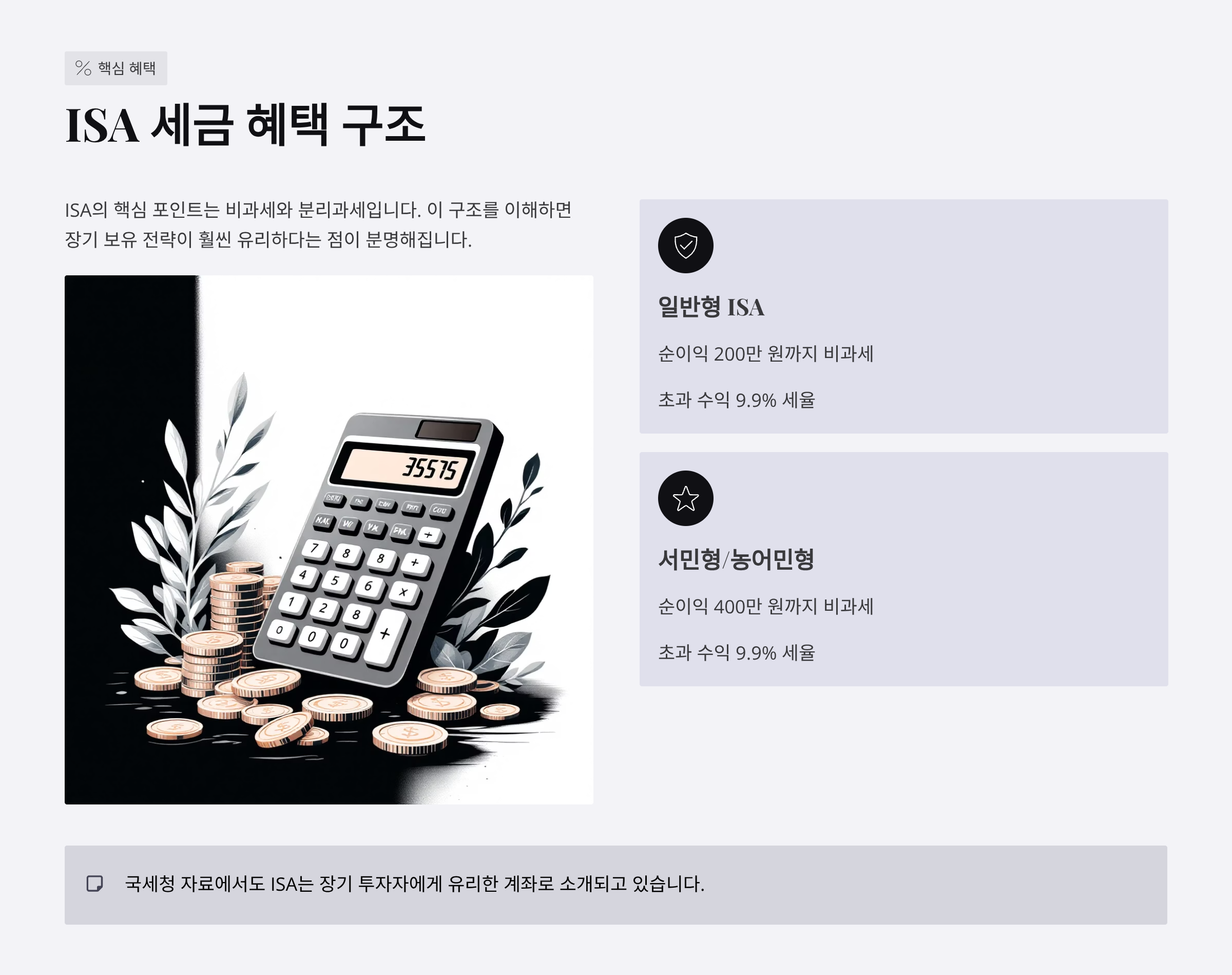 ISA의 핵심 포인트는 비과세와 분리과세입니다. 일반형 ISA 기준으로 순이익 200만 원까지는 비과세가 적용되고, 초과 수익에 대해서도 9.9%의 낮은 세율만 부담하면 됩니다. 서민형이나 농어민형 ISA는 비과세 한도가 400만 원까지 확대됩니다. 이 구조를 이해하고 나니 단기 매매보다는 장기 보유 전략이 훨씬 유리하다는 점이 분명해졌습니다. 국세청 자료에서도 ISA는 장기 투자자에게 유리한 계좌로 소개되고 있습니다. 🎯