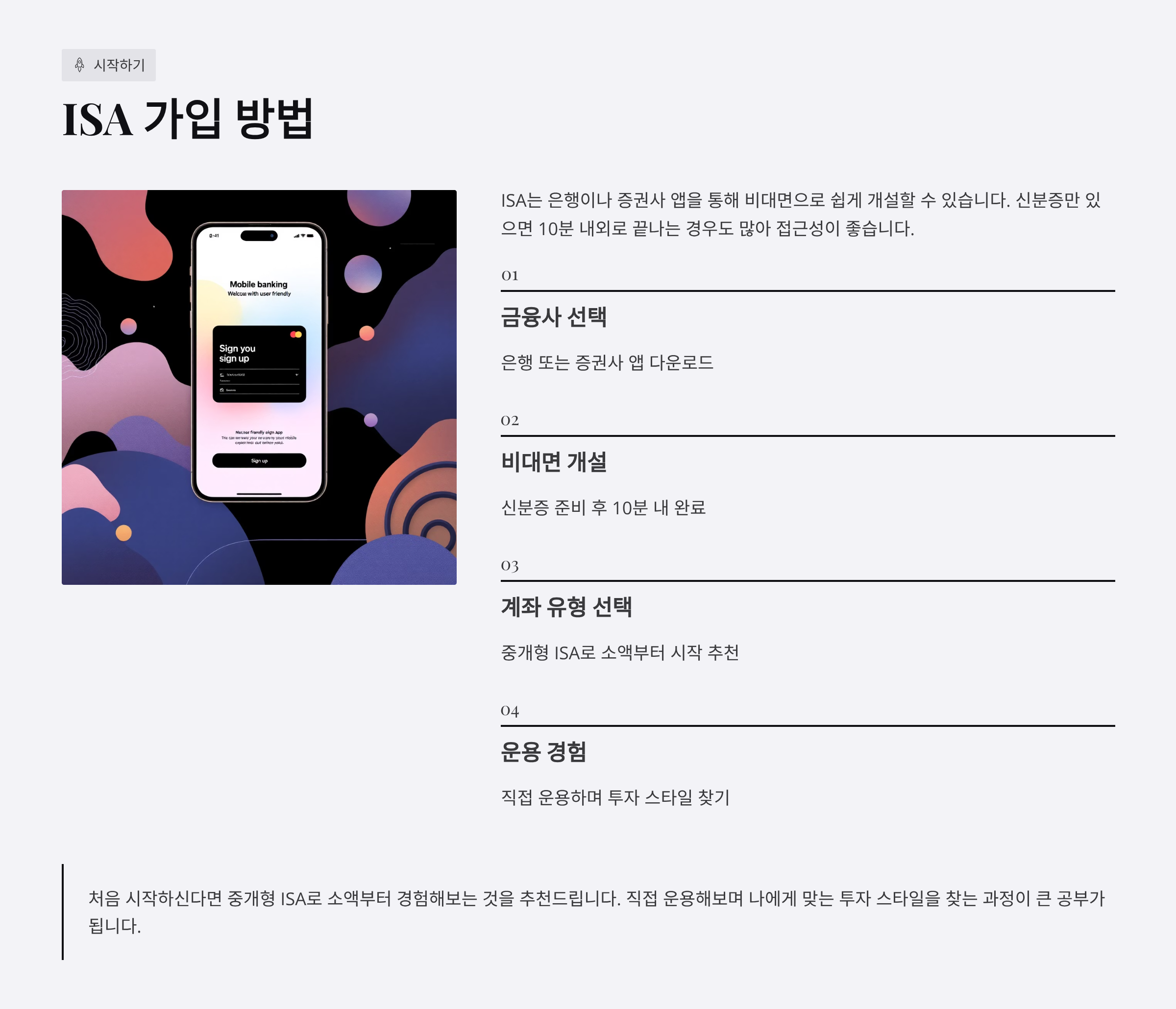ISA는 은행이나 증권사 앱을 통해 비대면으로 쉽게 개설할 수 있습니다. 신분증만 있으면 10분 내외로 끝나는 경우도 많아 접근성이 좋았습니다. 처음 시작하신다면 중개형 ISA로 소액부터 경험해보는 것을 추천드립니다. 직접 운용해보며 나에게 맞는 투자 스타일을 찾는 과정이 큰 공부가 되었습니다. 😊