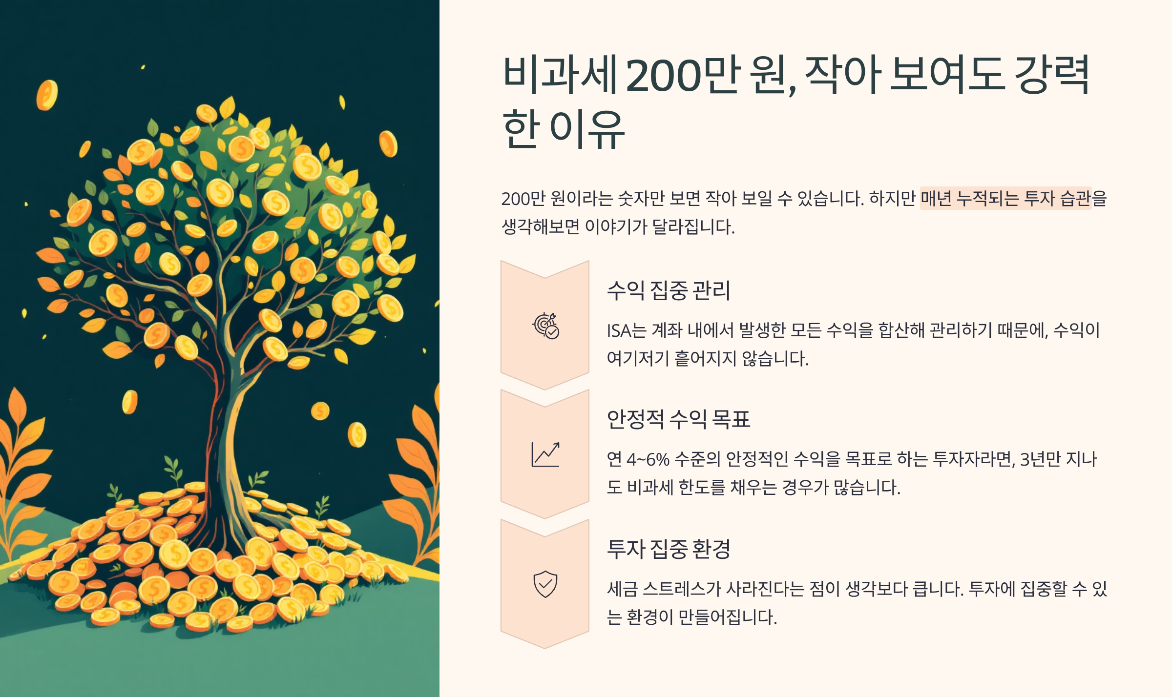 200만 원이라는 숫자만 보면 작아 보일 수 있습니다. 하지만 매년 누적되는 투자 습관을 생각해보면 이야기가 달라집니다. ISA는 계좌 내에서 발생한 모든 수익을 합산해 관리하기 때문에, 수익이 여기저기 흩어지지 않습니다.