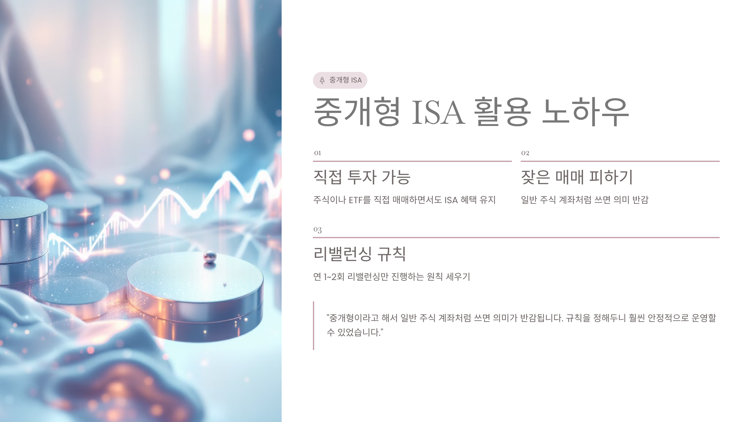 직접 투자에 관심이 있다면 중개형 ISA는 꽤 매력적인 선택입니다. 주식이나 ETF를 직접 매매할 수 있으면서도, 세금 구조는 ISA 혜택을 그대로 누릴 수 있기 때문이죠. 다만 여기서 중요한 건 잦은 매매를 피하는 겁니다. 중개형이라고 해서 일반 주식 계좌처럼 쓰면 의미가 반감됩니다. 저는 중개형 ISA에서는 “연 1~2회 리밸런싱만 한다”는 규칙을 정해두니 훨씬 안정적으로 운영할 수 있었습니다 🎯
