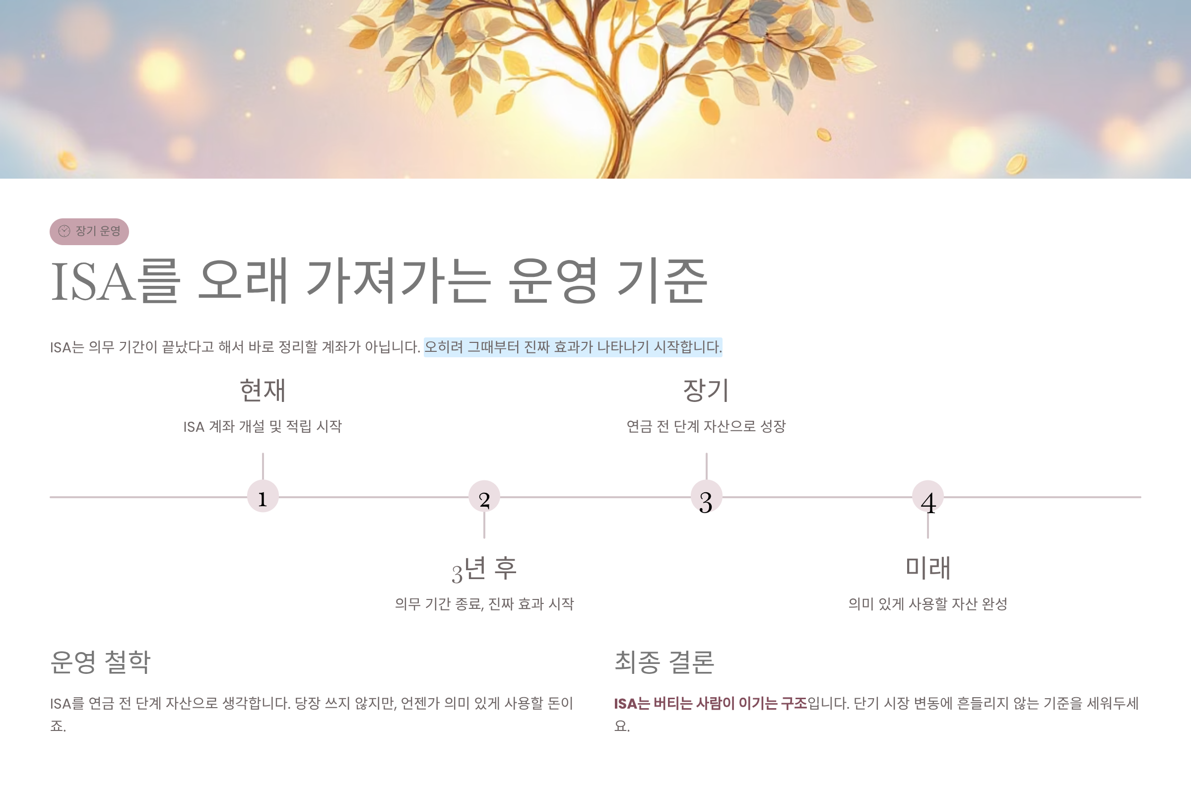 ISA는 의무 기간이 끝났다고 해서 바로 정리할 계좌가 아닙니다. 오히려 그때부터 진짜 효과가 나타나기 시작합니다. 저는 ISA를 연금 전 단계 자산으로 생각하고 있습니다. 당장 쓰지 않지만, 언젠가 의미 있게 사용할 돈 말이죠. 이렇게 기준을 세워두니, 단기 시장 변동에도 흔들리지 않게 되더라구요. 결국 ISA는 버티는 사람이 이기는 구조라는 걸 느끼게 됩니다 😊