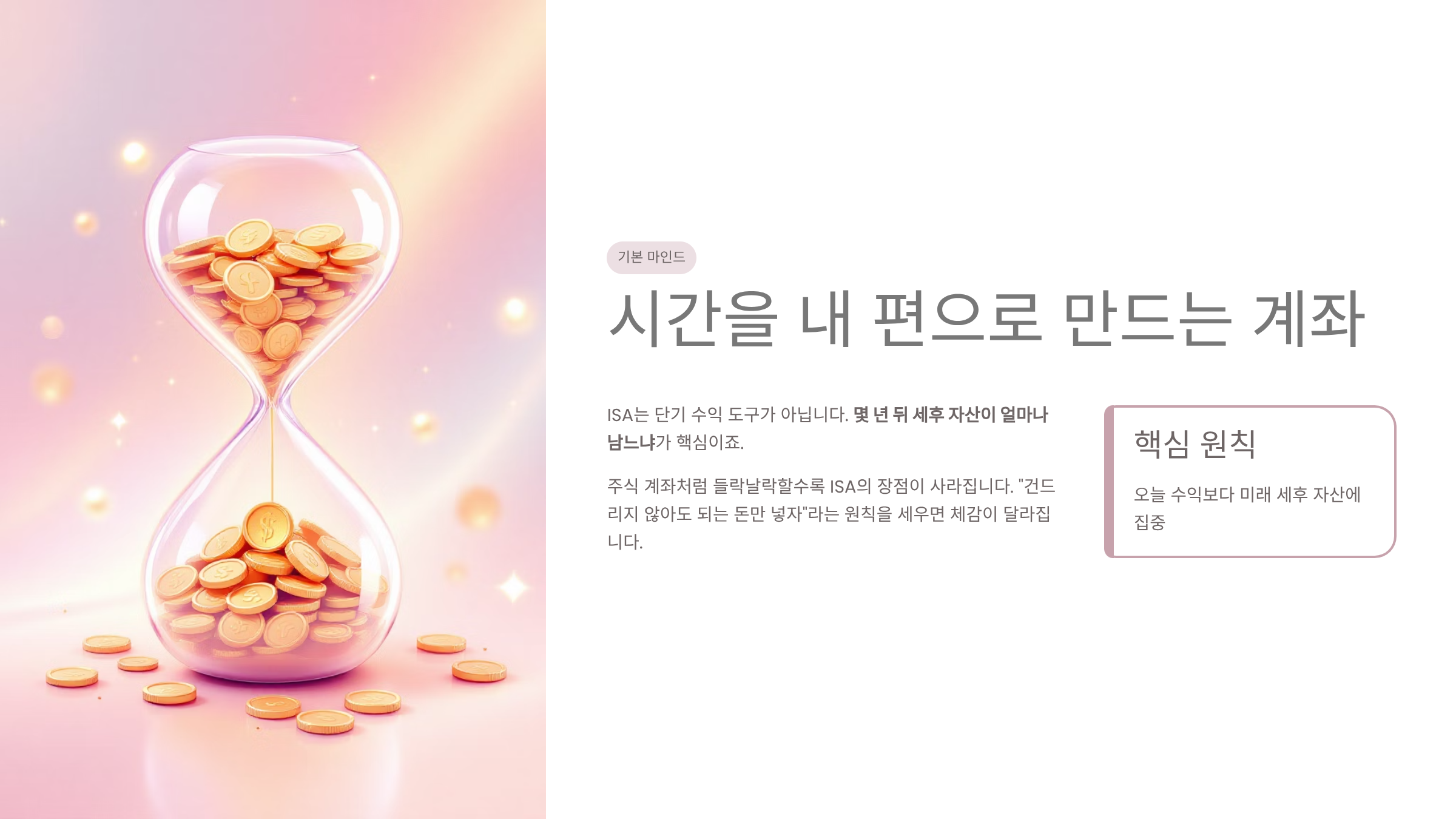 ISA를 제대로 활용하려면 가장 먼저 생각을 바꿔야 합니다. 이 계좌는 단기 수익을 뽑아내는 도구가 아니라, 시간을 내 편으로 만드는 계좌입니다. 오늘 수익이 나느냐보다, 몇 년 뒤 세후 자산이 얼마나 남느냐가 핵심이죠. 저도 처음엔 주식 계좌처럼 들락날락했는데, 그럴수록 ISA의 장점이 사라지더라구요. 이후로는 “건드리지 않아도 되는 돈만 넣자”라는 원칙을 세웠고, 그때부터 체감이 달라졌습니다 👍