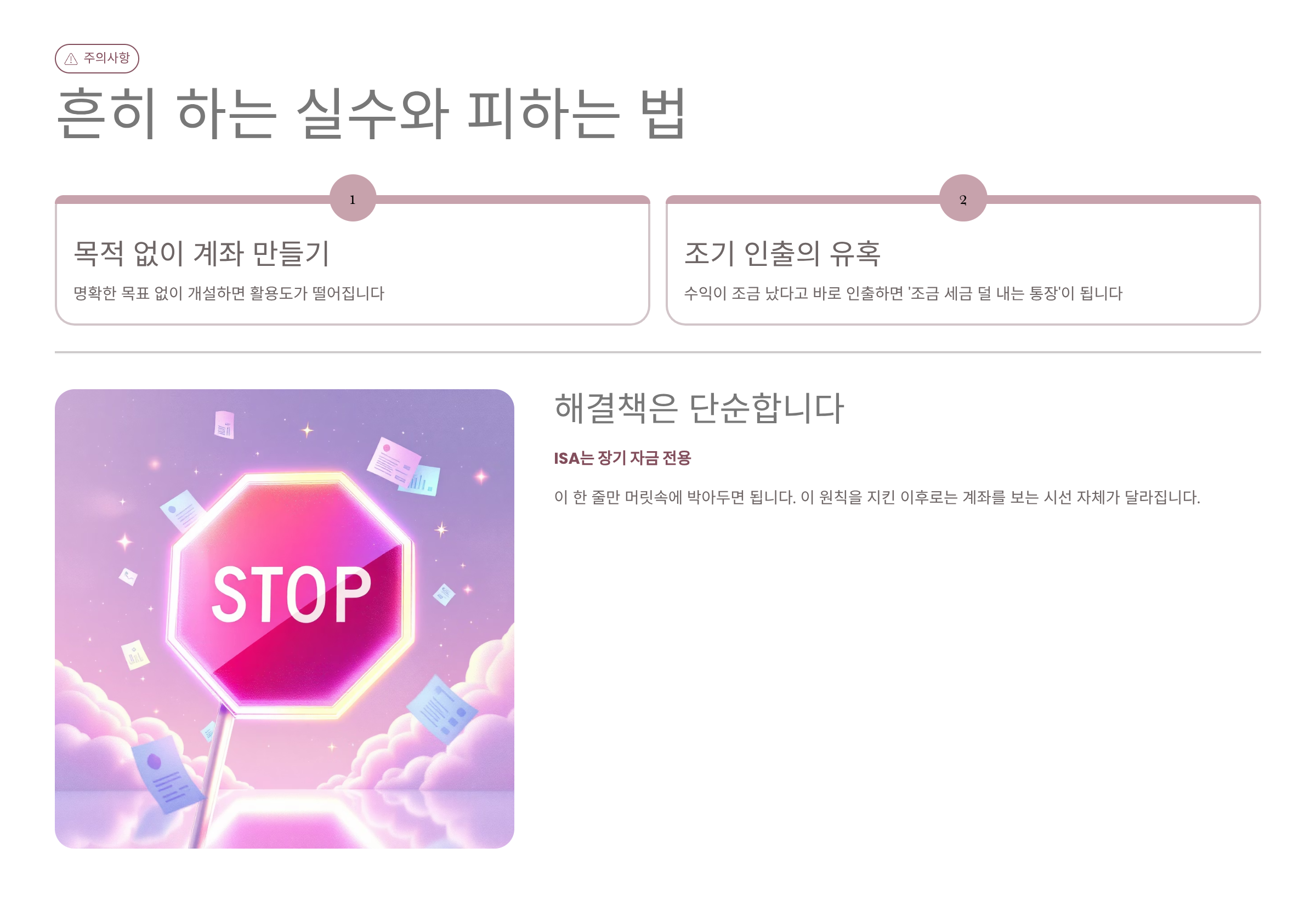 가장 흔한 실수는 목적 없이 계좌를 만드는 겁니다. 그리고 두 번째는 수익이 조금 났다고 바로 인출하는 행동이죠. 이렇게 되면 ISA는 그냥 ‘조금 세금 덜 내는 통장’이 되어버립니다. 피하는 방법은 단순합니다. ISA는 장기 자금 전용, 이 한 줄만 머릿속에 박아두시면 됩니다. 이 원칙을 지킨 이후로는 계좌를 보는 시선 자체가 달라졌습니다 🤔