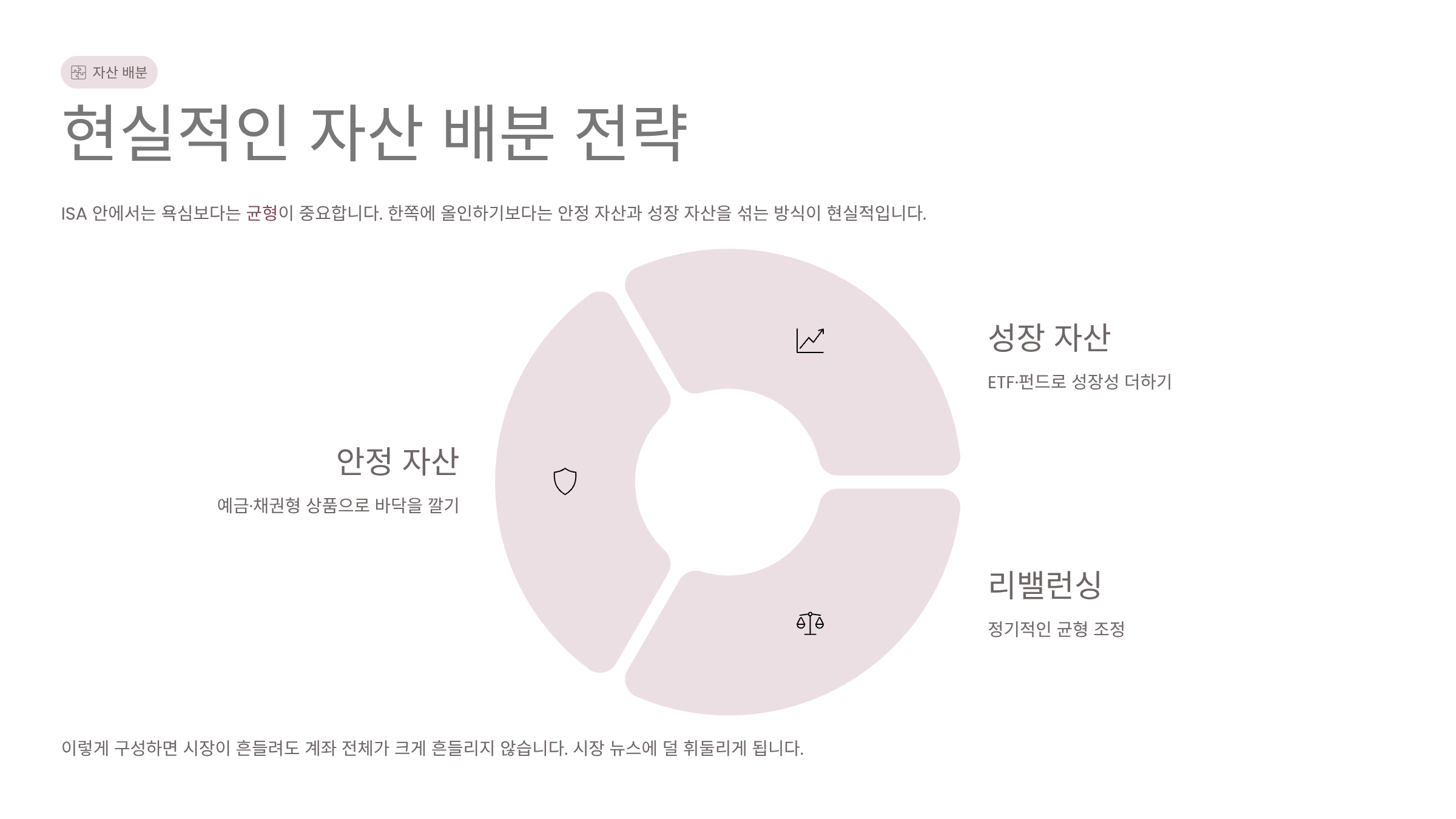 ISA 안에서는 욕심보다는 균형이 중요합니다. 한쪽에 올인하기보다는, 안정 자산과 성장 자산을 섞는 방식이 현실적입니다. 예를 들어 예금이나 채권형 상품으로 바닥을 깔고, ETF나 펀드로 성장성을 더하는 구조죠. 이렇게 구성하면 시장이 흔들려도 계좌 전체가 크게 흔들리지 않습니다. 저는 이 구조 덕분에 시장 뉴스에 덜 휘둘리게 됐습니다 ✅