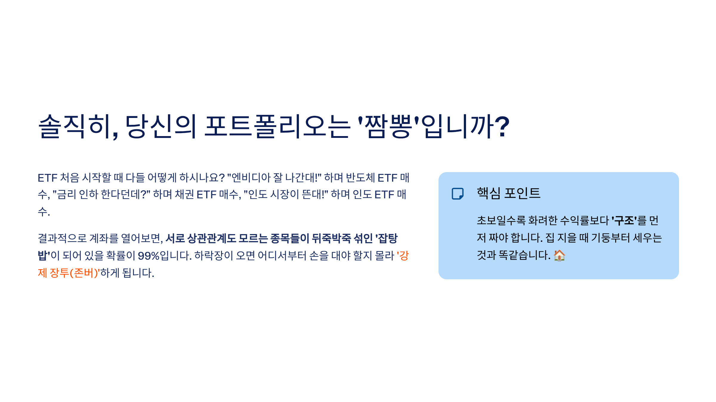 - 나쁜 예: 나스닥100(QQQ) 사고, 미국테크TOP10 사고, 애플 개별주 또 산다?