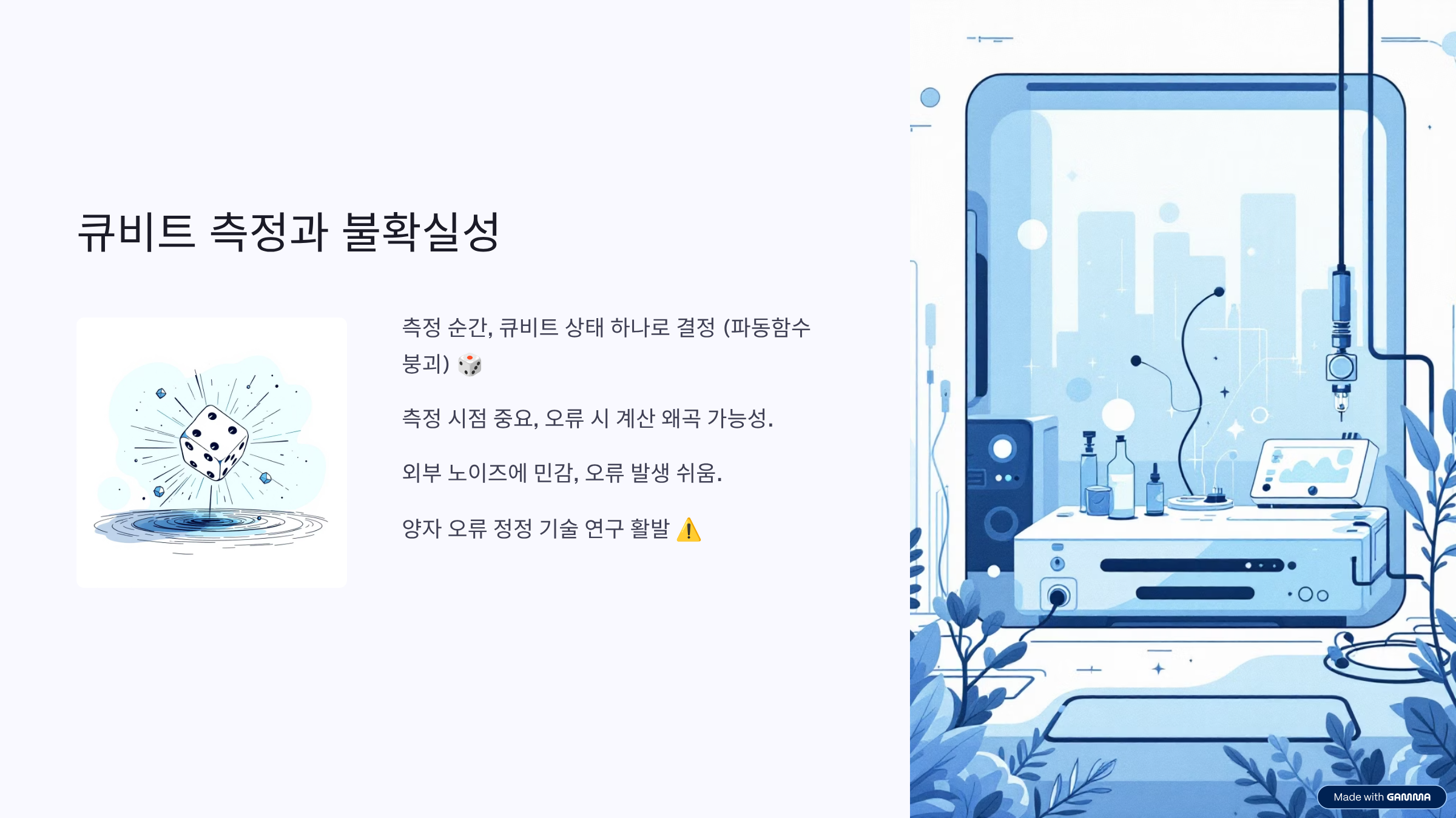 큐비트는 측정하는 순간 상태가 하나로 결정됩니다. 이걸 파동함수 붕괴라고 부르는데, 측정 전까지는 확률의 세계에 머물러 있습니다 🎲 그래서 양자컴퓨팅에서는 측정 시점이 굉장히 중요합니다. 잘못 측정하면 계산 결과가 왜곡될 수 있기 때문입니다. 또한 외부 환경의 작은 노이즈에도 큐비트는 쉽게 오류를 일으킵니다. 이를 해결하기 위해 양자 오류 정정 기술이 활발히 연구되고 있습니다. 개인적으로 이 부분을 보며, 양자컴퓨터가 아직 연구 단계에 머무는 이유를 이해하게 되었습니다. 가능성은 크지만, 다루기 정말 예민한 기술이라는 생각이 들었습니다 ⚠️