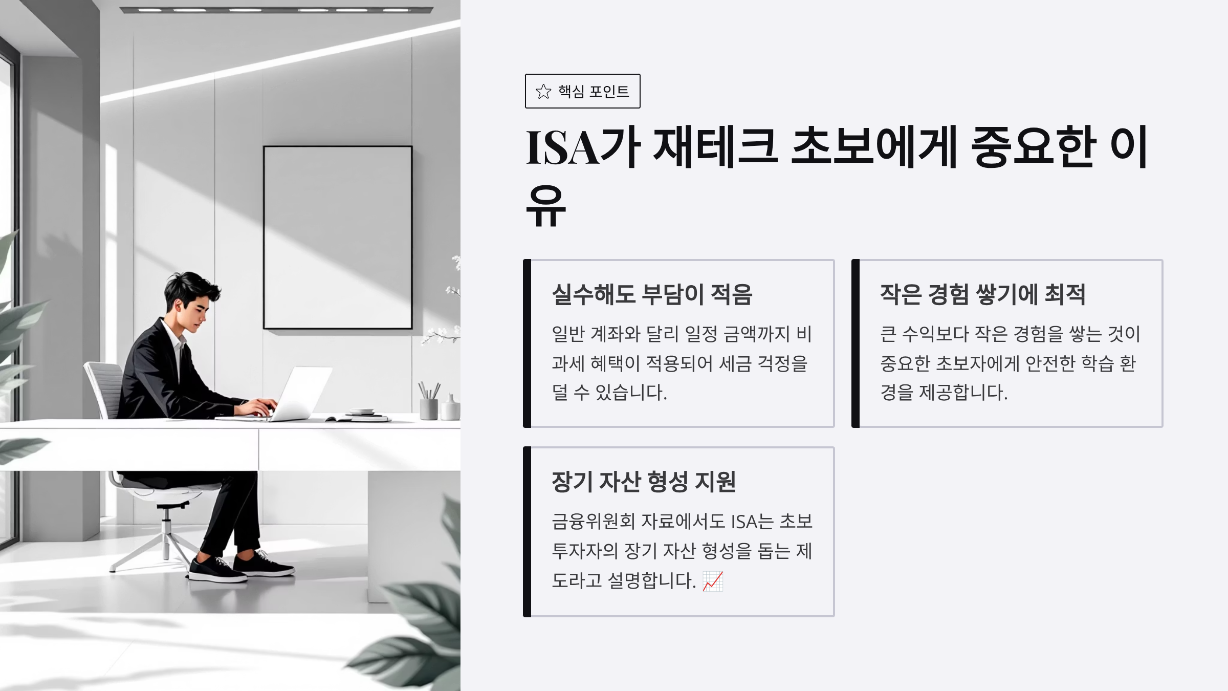 재테크 초보에게 ISA가 특히 중요한 이유는 ‘실수해도 부담이 적기 때문’입니다. 일반 계좌에서는 수익이 나면 바로 세금이 붙지만, ISA는 일정 금액까지 비과세 혜택이 적용됩니다. 저도 처음 투자했을 때 큰 수익보다 작은 경험을 쌓는 게 중요했는데, ISA 덕분에 세금 걱정을 덜 수 있었습니다. 금융위원회 자료에서도 ISA는 초보 투자자의 장기 자산 형성을 돕는 제도라고 설명합니다. 세금 구조를 이해하는 것만으로도 재테크 감각이 달라집니다. 📈
