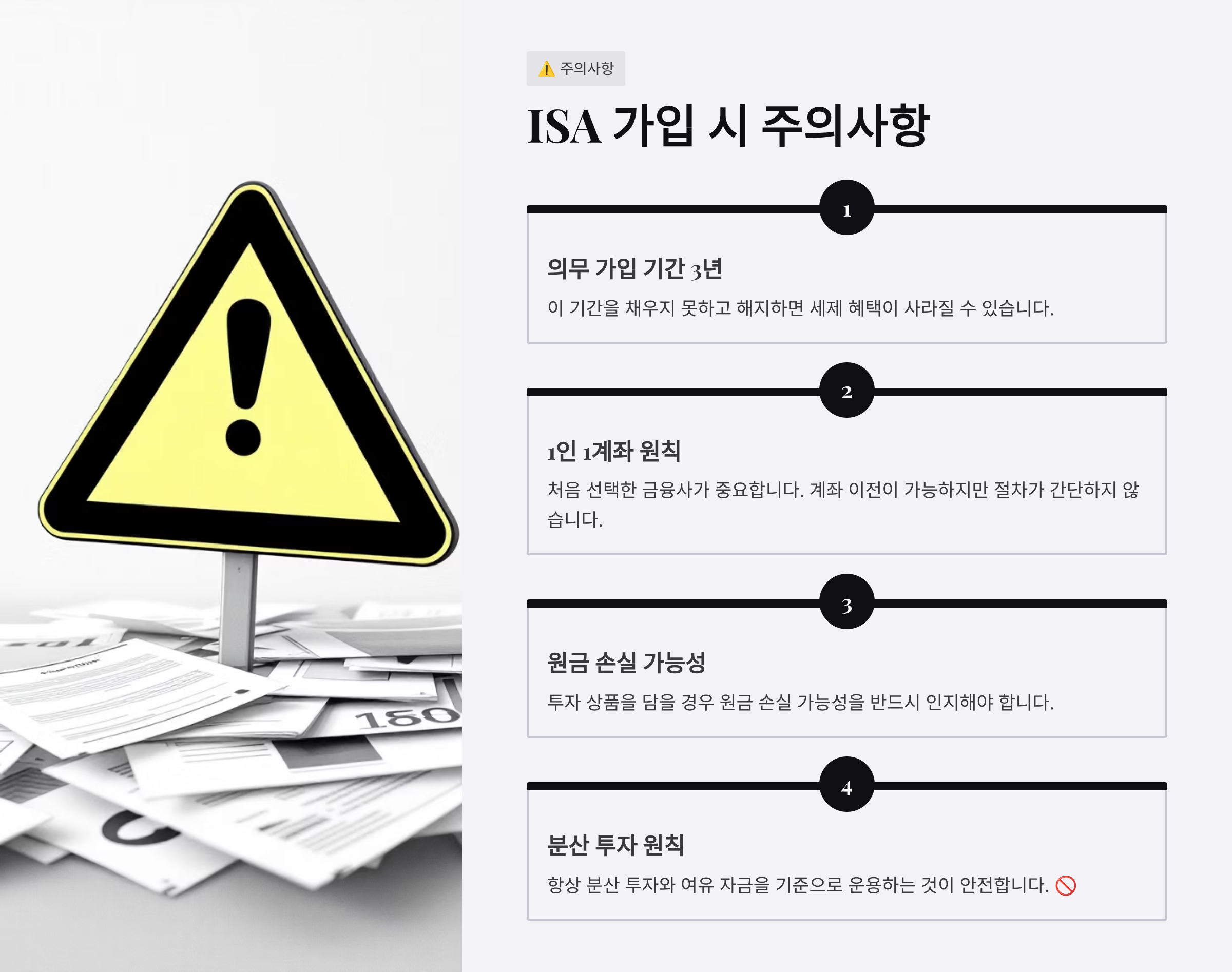ISA에는 의무 가입 기간 3년이 존재합니다. 이 기간을 채우지 못하고 해지하면 세제 혜택이 사라질 수 있습니다. 또한 1인 1계좌만 개설 가능하기 때문에 처음 선택한 금융사가 중요합니다. 계좌 이전이 가능하긴 하지만 절차가 간단하지는 않습니다. 투자 상품을 담을 경우 원금 손실 가능성도 반드시 인지해야 합니다. 그래서 저는 항상 분산 투자와 여유 자금을 기준으로 운용하고 있습니다. 🚫