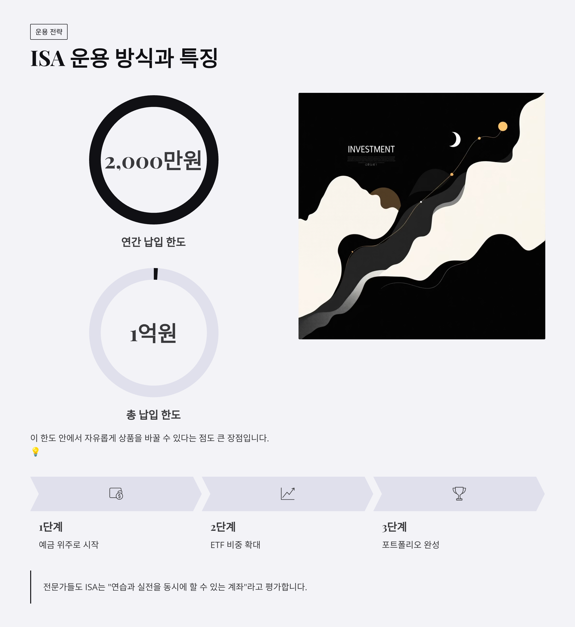 ISA는 연간 납입 한도 2,000만 원, 총 한도 1억 원까지 납입할 수 있습니다. 이 한도 안에서 자유롭게 상품을 바꿀 수 있다는 점도 큰 장점입니다. 저는 처음에는 예금 위주로 시작했다가, 익숙해지면서 ETF 비중을 조금씩 늘렸습니다. 이런 단계적인 운용이 가능한 구조라 초보자에게 특히 잘 맞는다고 느꼈습니다. 전문가들도 ISA는 “연습과 실전을 동시에 할 수 있는 계좌”라고 평가합니다. 💡 [그래프 삽입 위치: ISA 단계별 운용 예시]