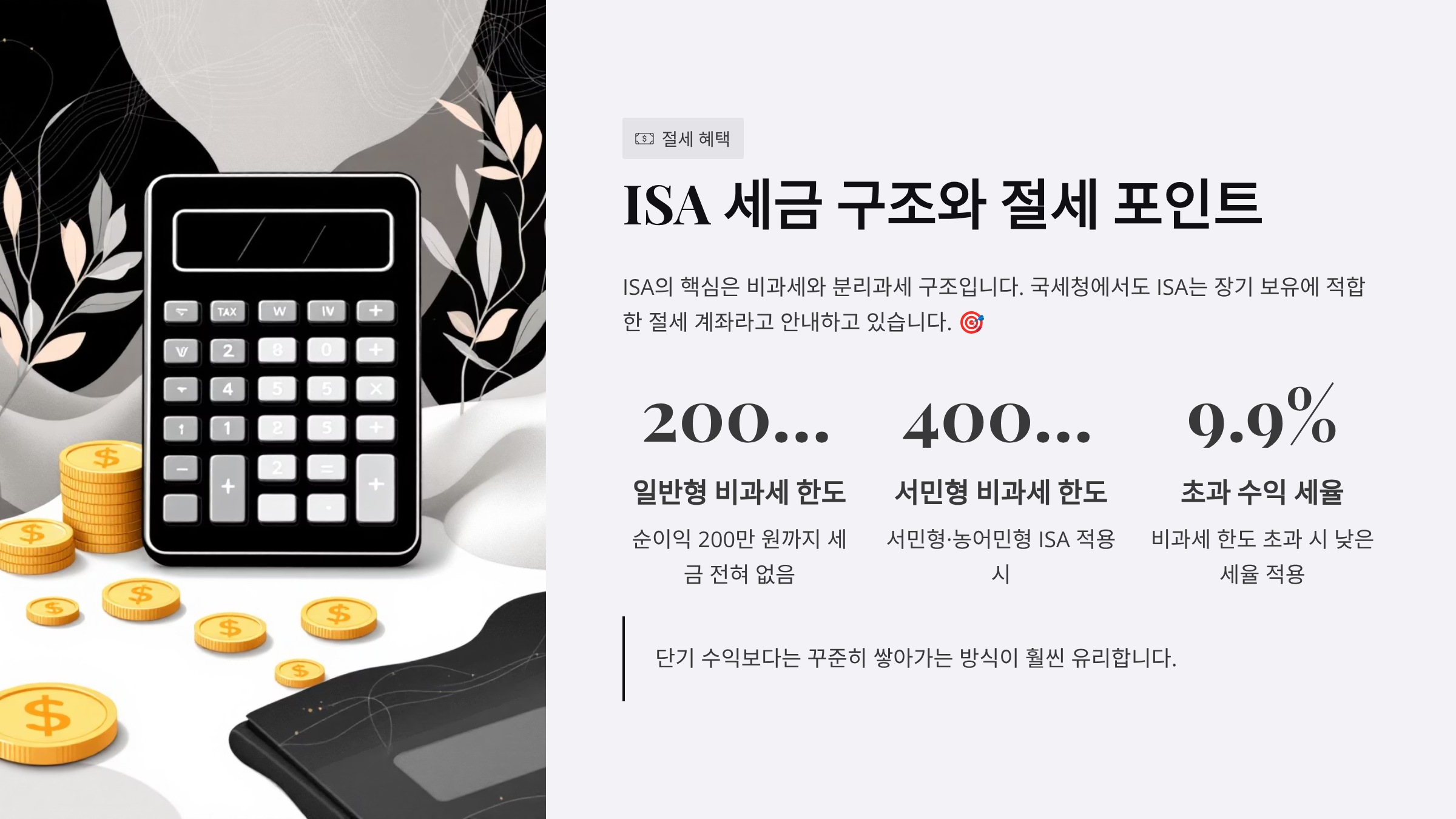 ISA의 핵심은 비과세와 분리과세 구조입니다. 일반형 ISA 기준으로 순이익 200만 원까지는 세금이 전혀 없고, 초과 수익도 9.9%의 낮은 세율만 적용됩니다. 서민형이나 농어민형 ISA는 비과세 한도가 400만 원까지 늘어납니다. 이 구조를 알고 나니, 단기 수익보다는 꾸준히 쌓아가는 방식이 훨씬 유리하다는 걸 체감하게 되었습니다. 국세청에서도 ISA는 장기 보유에 적합한 절세 계좌라고 안내하고 있습니다. 🎯