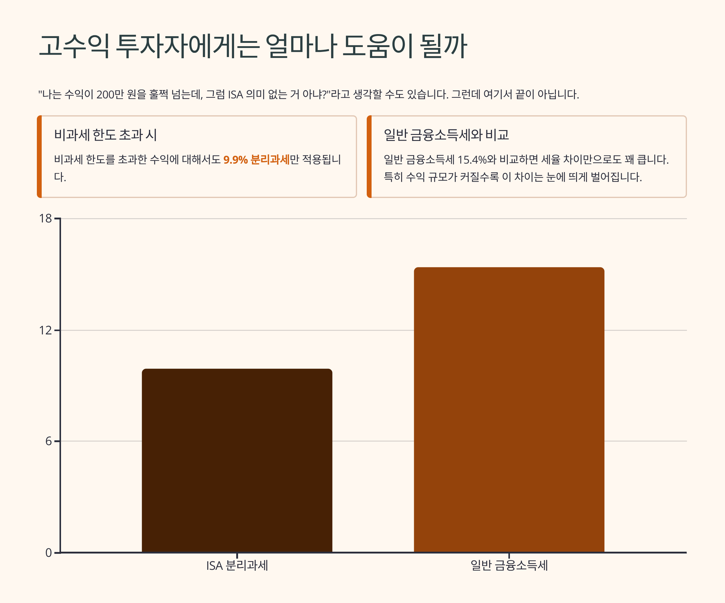 일반 금융소득세 15.4%와 비교하면 세율 차이만으로도 꽤 큽니다. 특히 수익 규모가 커질수록 이 차이는 눈에 띄게 벌어집니다 📈