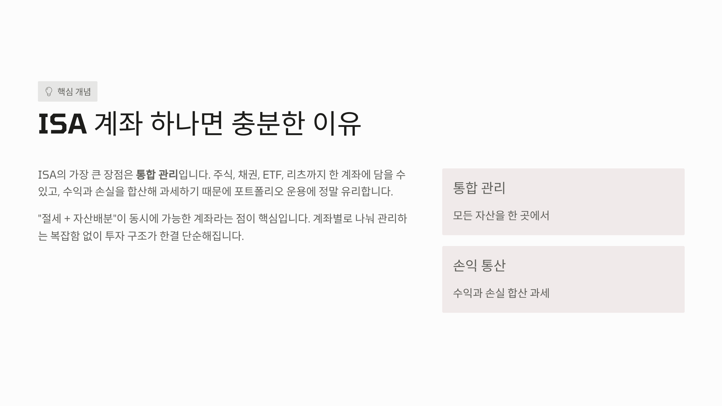 ISA의 가장 큰 장점은 통합 관리입니다. 주식, 채권, ETF, 리츠까지 한 계좌에 담을 수 있고, 수익과 손실을 합산해 과세하기 때문에 포트폴리오 운용에 정말 유리합니다. 저도 예전에는 계좌별로 나눠 관리하느라 복잡했는데, ISA 중심으로 정리하니 투자 구조가 한결 단순해졌습니다 👍 “절세 + 자산배분”이 동시에 가능한 계좌라는 점이 핵심입니다.