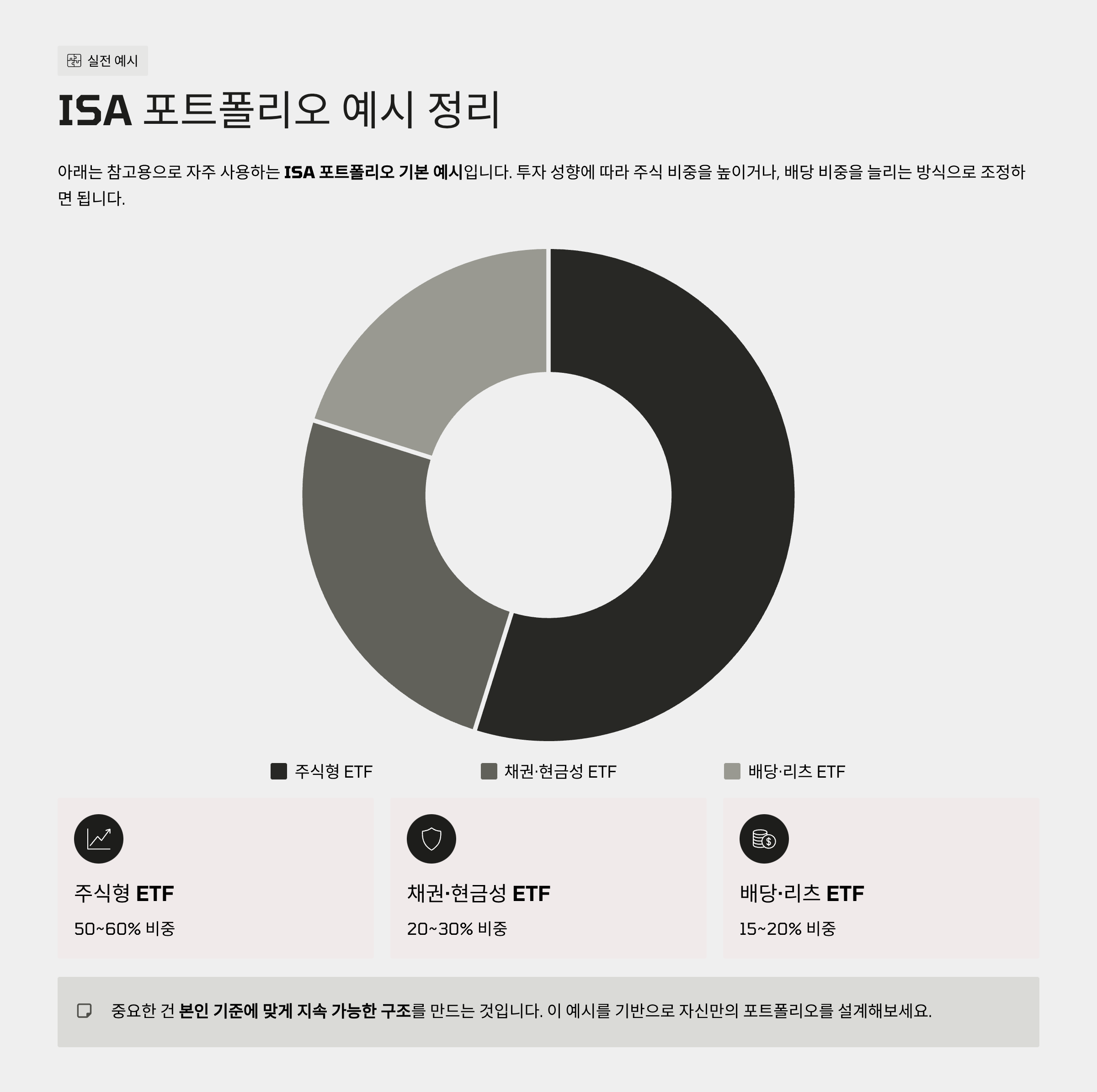 아래는 제가 참고용으로 자주 사용하는 ISA 포트폴리오 기본 예시입니다.