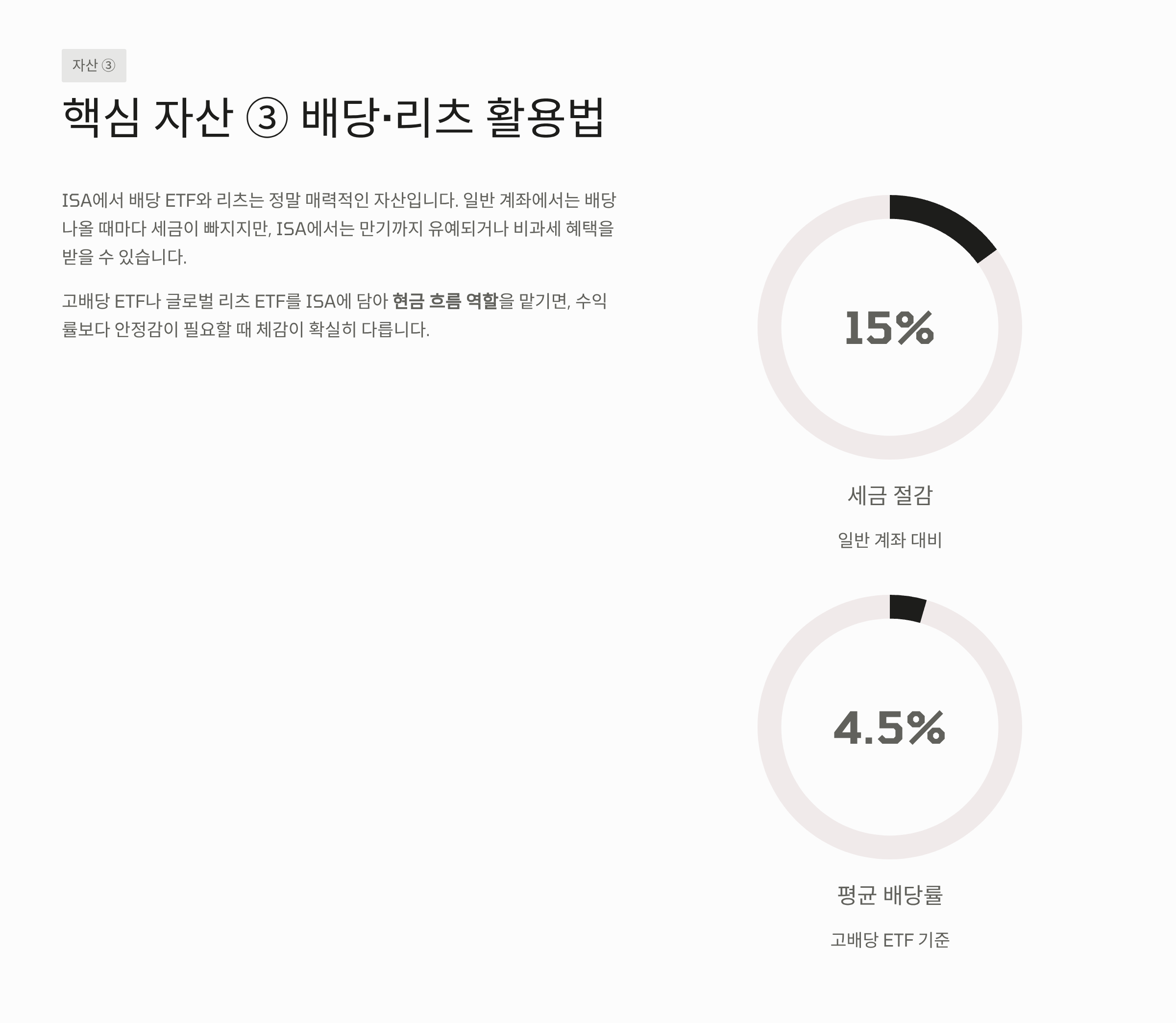 ISA에서 배당 ETF와 리츠는 정말 매력적인 자산입니다. 일반 계좌에서는 배당 나올 때마다 세금이 빠지지만, ISA에서는 만기까지 유예되거나 비과세 혜택을 받을 수 있기 때문입니다. 저는 고배당 ETF나 글로벌 리츠 ETF를 ISA에 담아 현금 흐름 역할을 맡기고 있습니다. 수익률보다 안정감이 필요할 때 체감이 확실히 다릅니다 😊