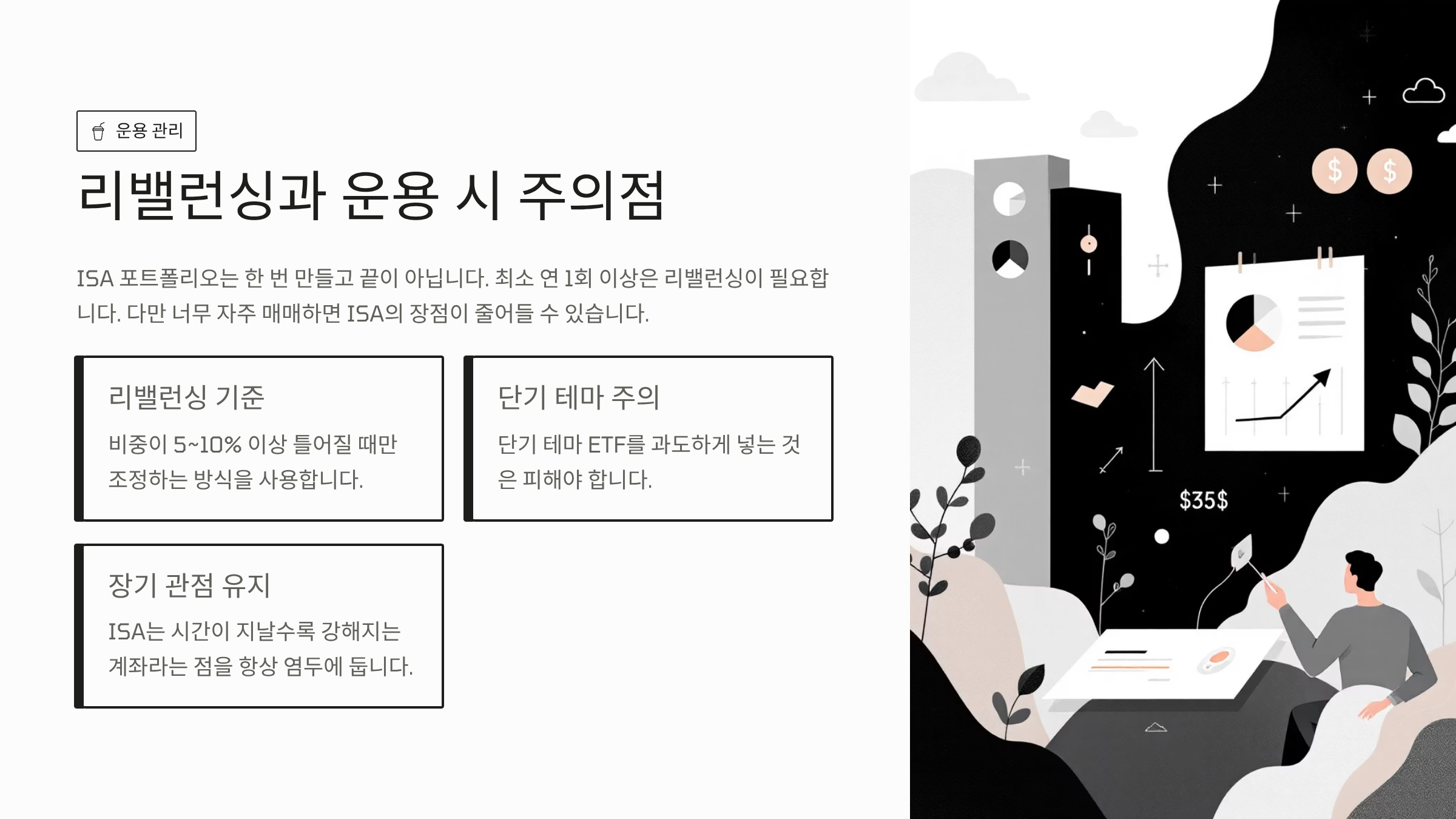 ISA 포트폴리오는 한 번 만들고 끝이 아닙니다. 최소 연 1회 이상은 리밸런싱이 필요합니다. 다만 너무 자주 매매하면 ISA의 장점이 줄어들 수 있습니다. 저는 비중이 5~10% 이상 틀어질 때만 조정하는 방식을 쓰고 있습니다. 또 단기 테마 ETF를 과도하게 넣는 것도 주의해야 합니다. ISA는 시간이 지날수록 강해지는 계좌라는 점을 항상 염두에 두는 게 중요합니다 ⚠️