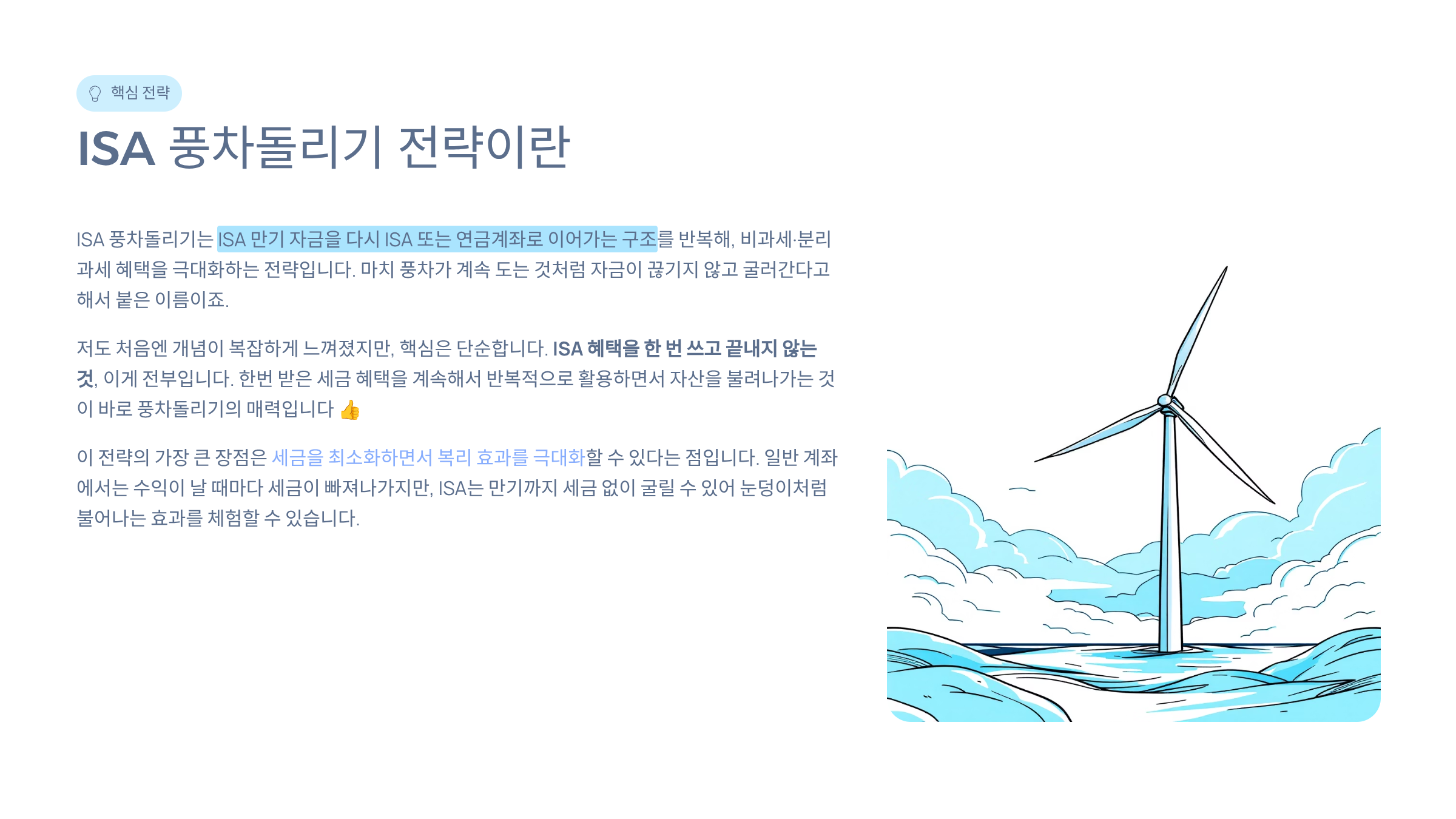 ISA 풍차돌리기는 ISA 만기 자금을 다시 ISA 또는 연금계좌로 이어가는 구조를 반복해, 비과세·분리과세 혜택을 극대화하는 전략입니다. 마치 풍차가 계속 도는 것처럼 자금이 끊기지 않고 굴러간다고 해서 붙은 이름이죠. 저도 처음엔 개념이 복잡하게 느껴졌지만, 핵심은 단순합니다. ISA 혜택을 한 번 쓰고 끝내지 않는 것, 이게 전부입니다 👍