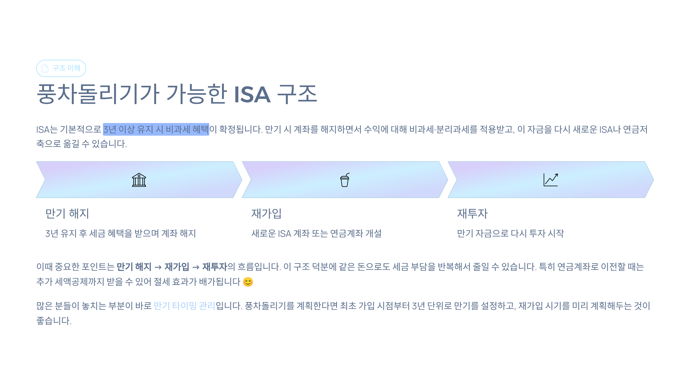 ISA는 기본적으로 3년 이상 유지 시 비과세 혜택이 확정됩니다. 만기 시 계좌를 해지하면서 수익에 대해 비과세·분리과세를 적용받고, 이 자금을 다시 새로운 ISA나 연금저축으로 옮길 수 있습니다. 이때 중요한 포인트는 만기 해지 → 재가입 → 재투자의 흐름입니다. 이 구조 덕분에 같은 돈으로도 세금 부담을 반복해서 줄일 수 있습니다 😊
