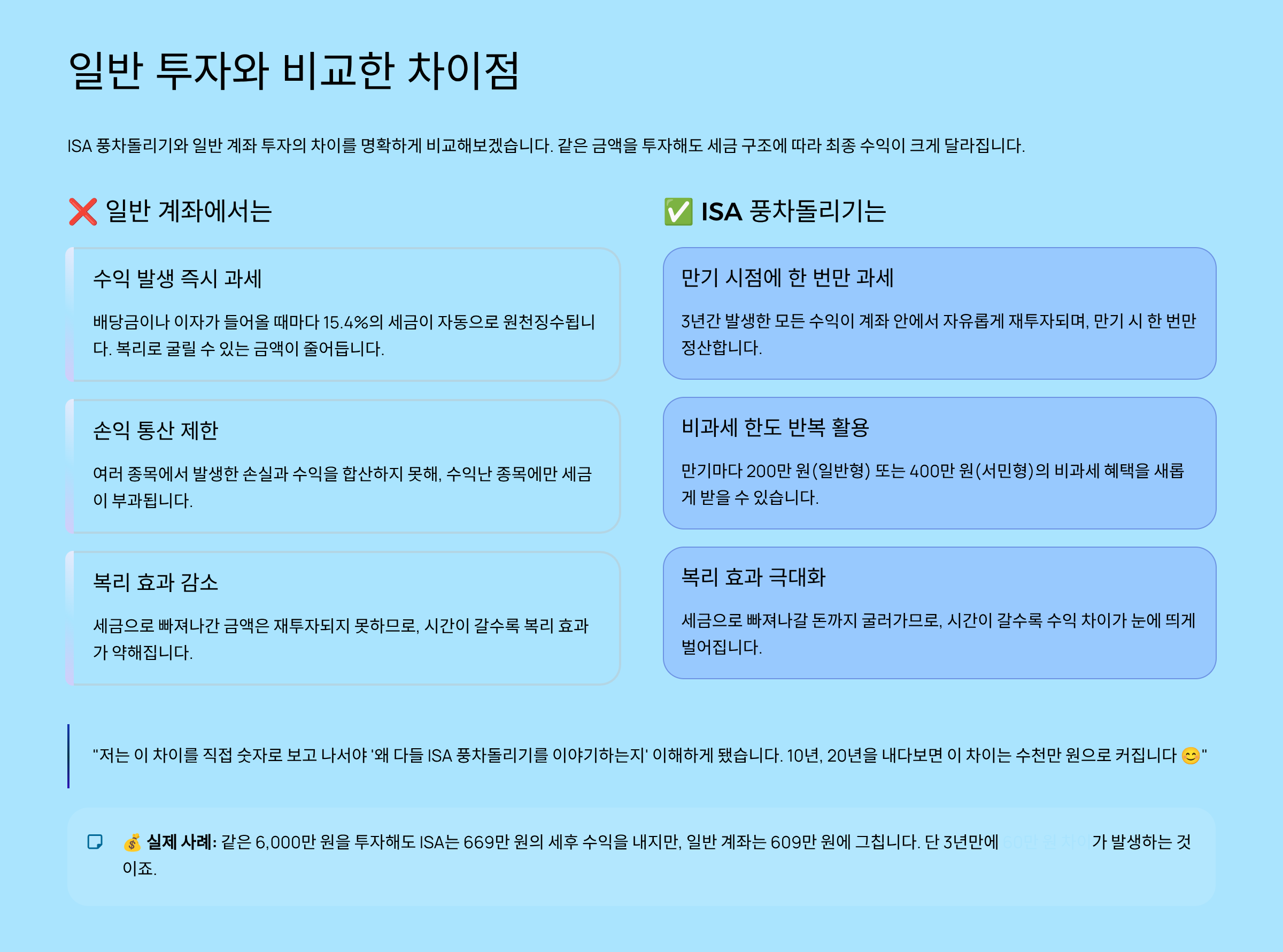 같은 조건으로 일반 계좌였다면, 이자·배당 발생 시점마다 15.4% 세금이 빠져 체감 수익은 더 줄어듭니다. 이 차이가 바로 풍차돌리기의 핵심 효과입니다 📉