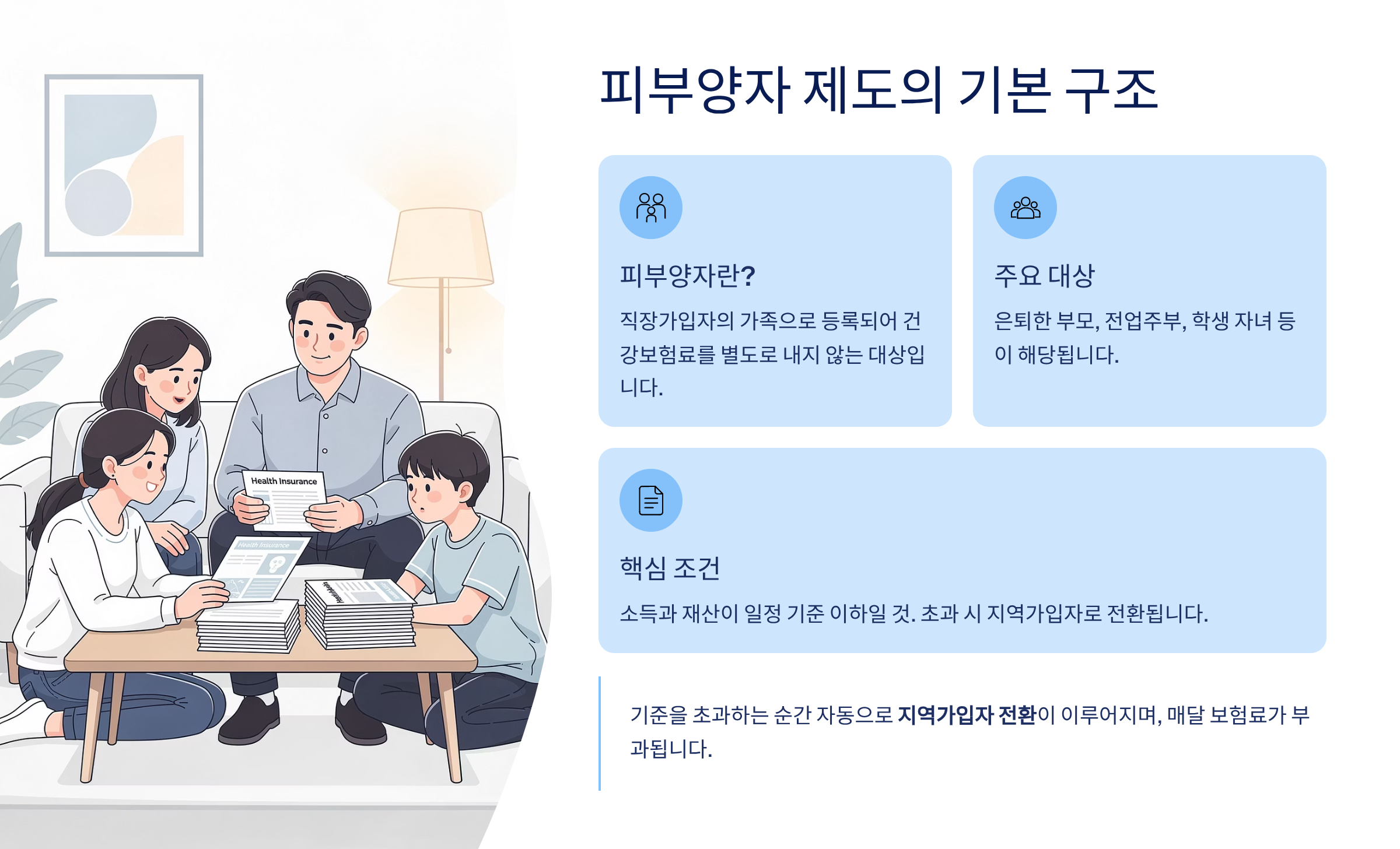피부양자는 직장가입자의 가족으로 등록되어 건강보험료를 별도로 내지 않는 대상입니다. 주로 은퇴한 부모, 전업주부, 학생 자녀 등이 해당됩니다. 하지만 핵심은 ‘소득과 재산이 일정 기준 이하일 것’입니다. 이 기준을 초과하는 순간 자동으로 지역가입자 전환이 이루어지며, 매달 보험료가 부과됩니다.