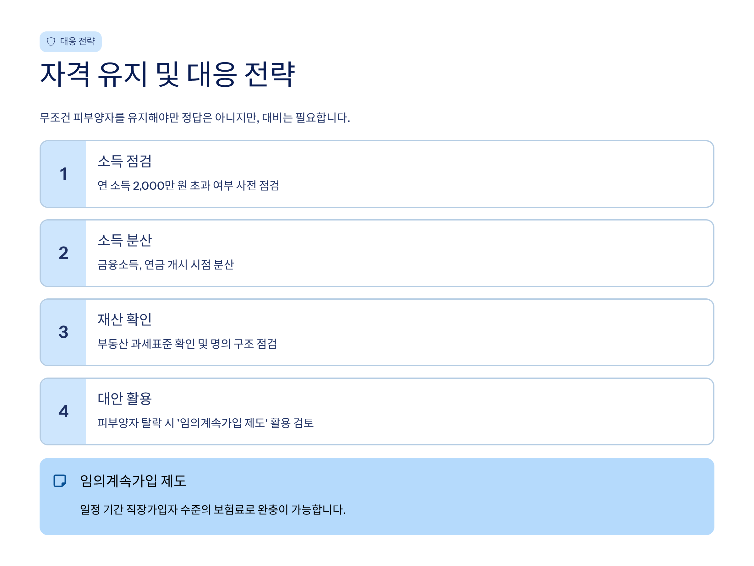 ✔ 피부양자 탈락 시 ‘임의계속가입 제도’ 활용 검토