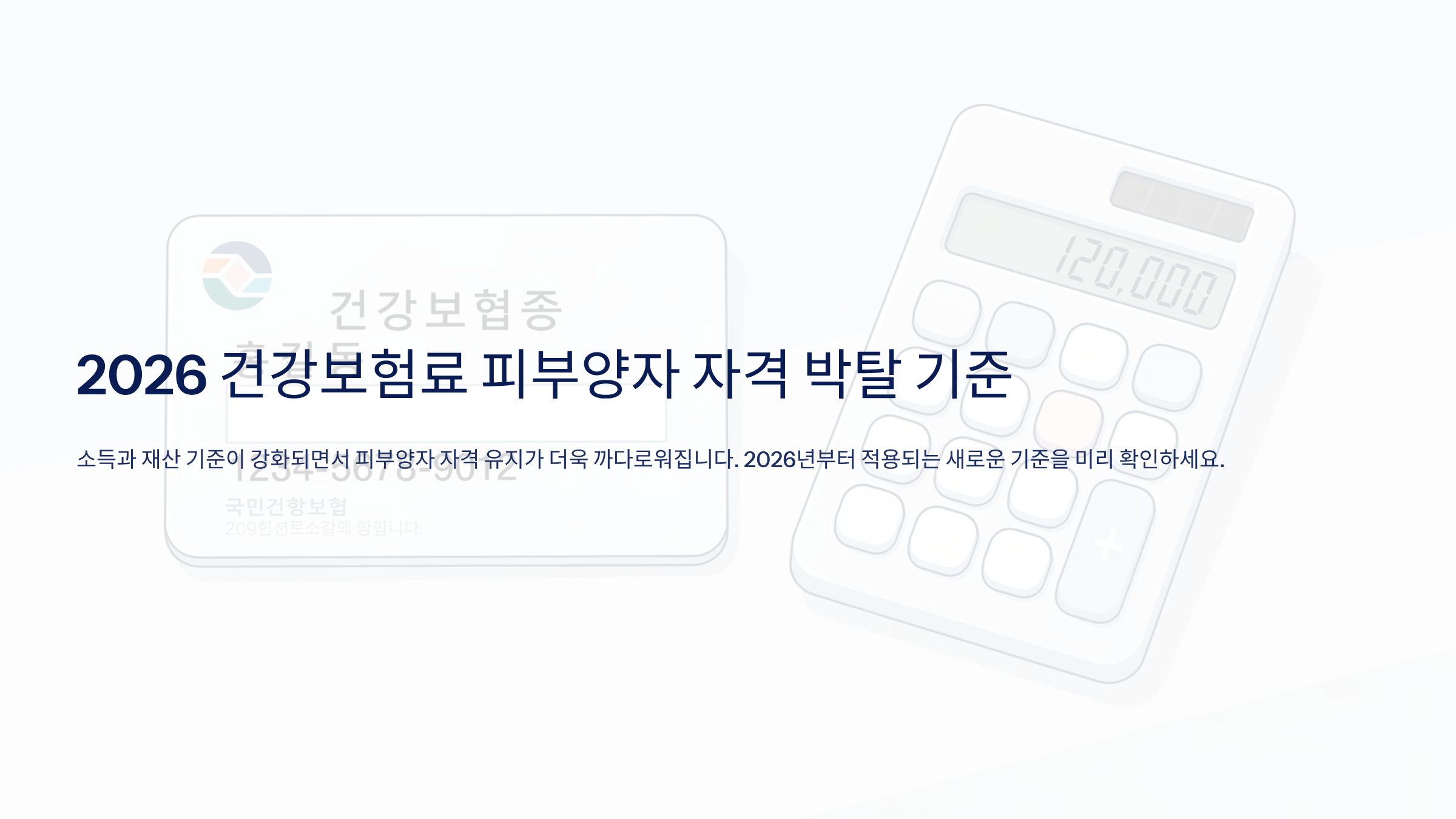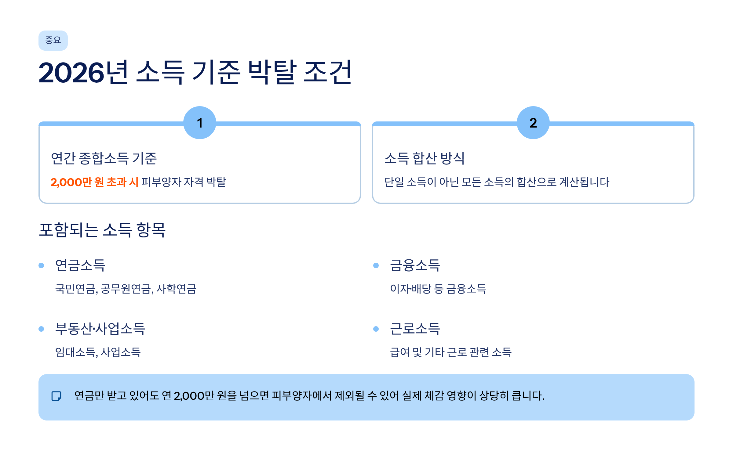2026년 기준 가장 중요한 변화는 연간 종합소득 2,000만 원 초과 시 피부양자 자격 박탈입니다.