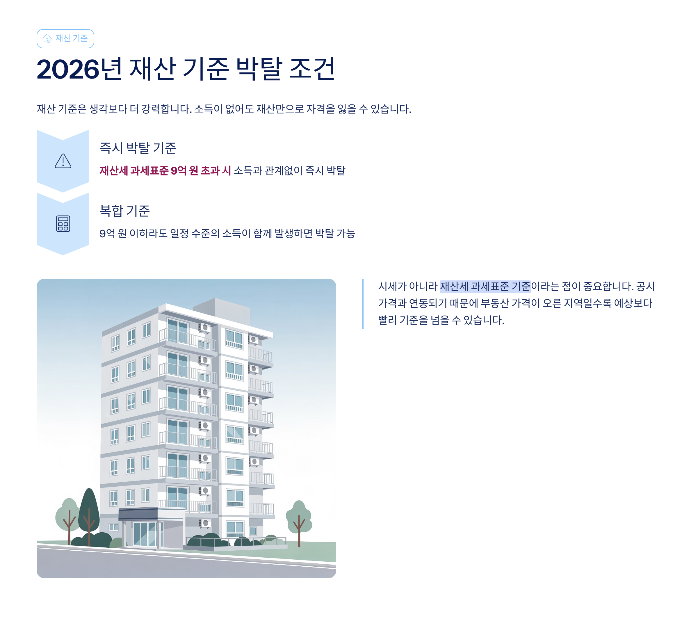 👉 재산세 과세표준 9억 원 초과 시 소득과 관계없이 즉시 박탈