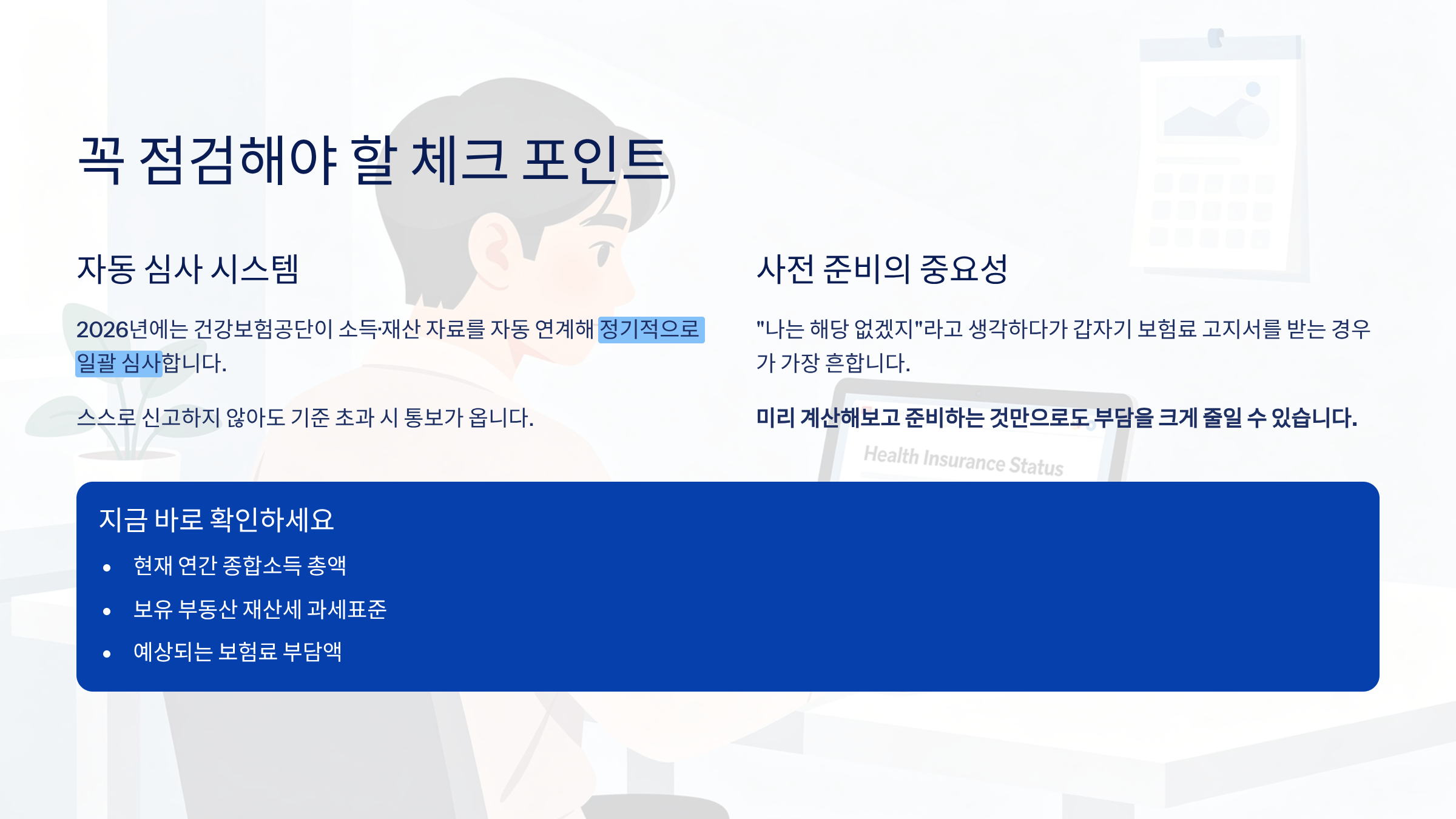 “나는 해당 없겠지”라고 생각하다가 갑자기 보험료 고지서를 받는 경우가 가장 흔했습니다. 미리 계산해보고 준비하는 것만으로도 부담을 크게 줄일 수 있습니다.